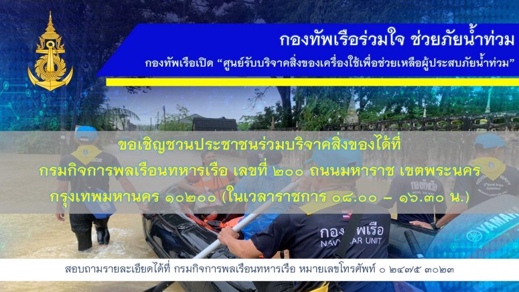 กองทัพเรือ เปิดศูนย์รับบริจาคสิ่งของเครื่องใช้เพื่อช่วยเหลือผู้ประสบภัยน้ำท่วม ข่าวสารกิจกรรม, สาธารณภัย กองทัพเรือ เปิดศูนย์รับบริจาคสิ่งของเครื่องใช้เพื่อช่วยเหลือผู้ประสบภัยน้ำท่วม กองทัพเรือ เปิดศูนย์รับบริจาคสิ่งของเครื่องใช้เพื่อช่วยเหลือผู้ประสบภัยน้ำท่วม จากเหตุการณ์น้ำท่วมในพื้นที่ภาคใต้ส่งผลให้ประชาชนได้รับความเดือนร้อนจากภัยน้ำท่วม กองทัพเรือจึงได้ทำการเปิดศูนย์รับบริจาคสิ่งของเครื่องใช้เพื่อช่วยเหลือผู้ประสบภัยน้ำท่วม โดยบริจาคได้ที่ กรมกิจการพลเรือนทหารเรือ เลขที่ 200 ถนนมหาราช เขตพระนคร กรุงเทพมหานคร 10200 หรือสอบถามรายละเอียดได้ที่ กรมกิจการพลเรือนทหารเรือ หมายเลขโทรศัพท์ 0 2475 3023 ที่มา : Facebook กองทัพเรือ Royal Thai Navy Post Views: 11 FacebookFacebookXTwitterLINELine