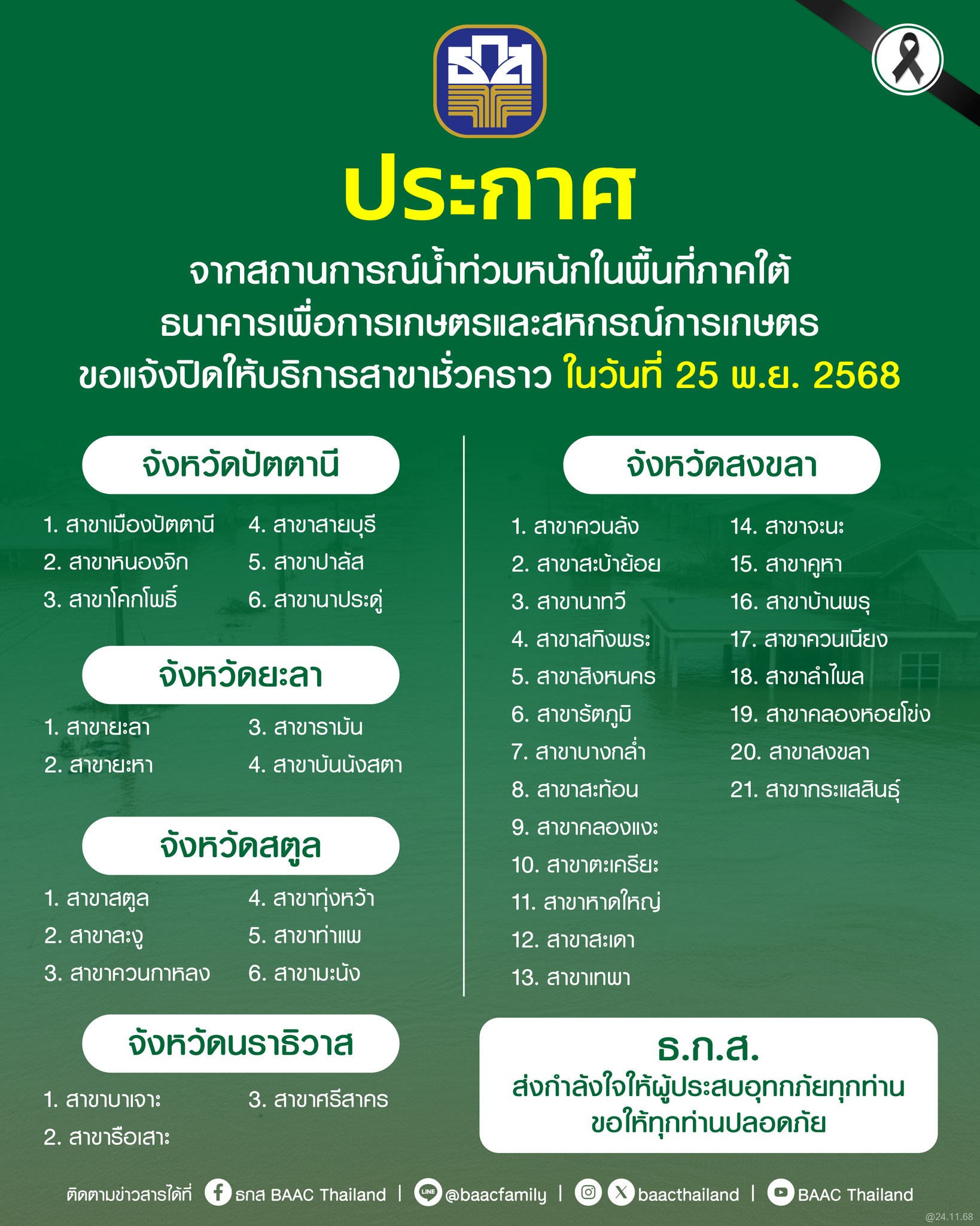 เนื่องจากสถานการณ์น้ำท่วมหนักในพื้นที่ภาคใต้ จึงขอแจ้งปิดให้บริการสาขาใน 5 จังหวัด ในวันอังคารที่ 25 พฤศจิกายน 2568 ดังนี้