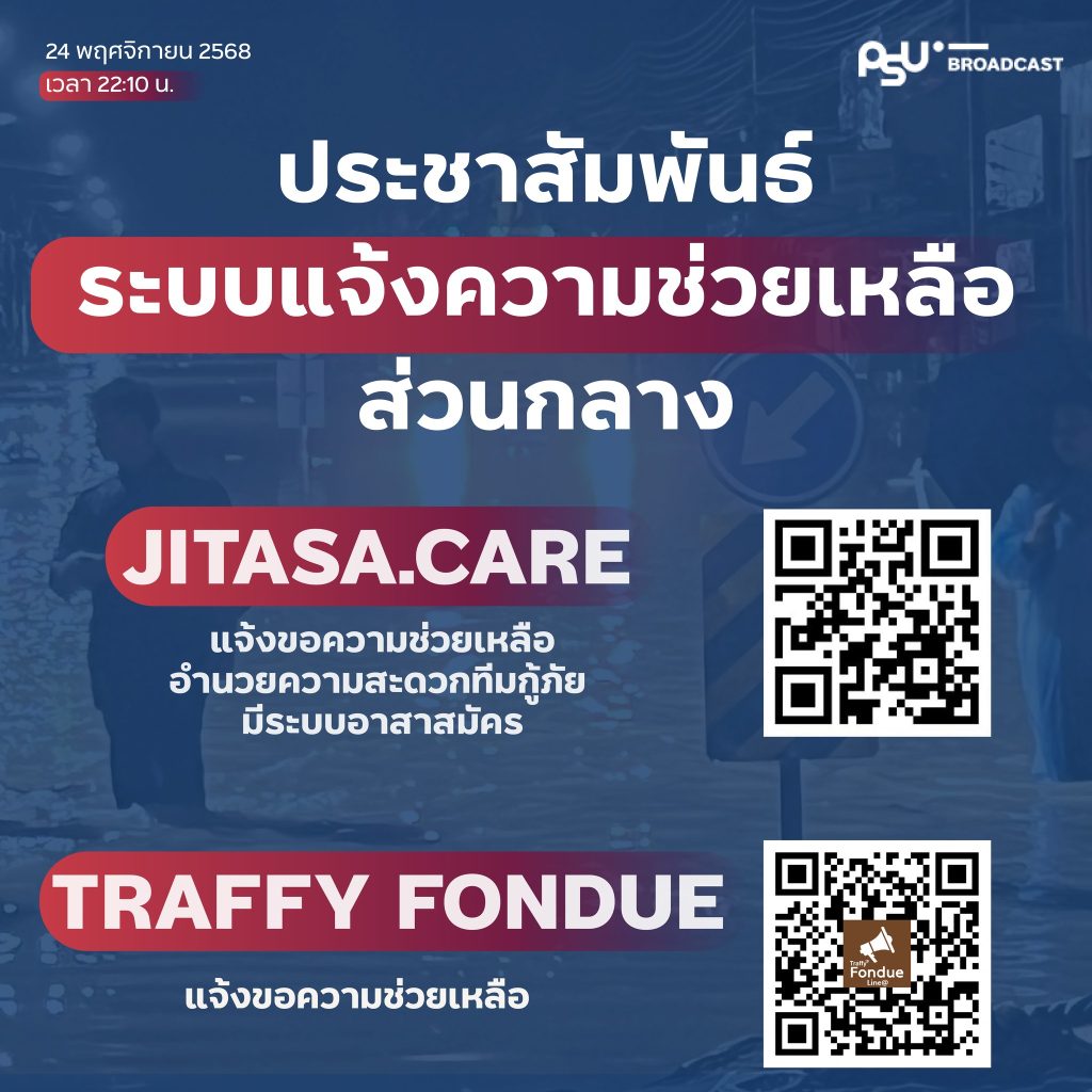 มหาวิทยาลัยสงขลานครินทร์ วิทยาเขตหาดใหญ่ แจ้งระบบขอความช่วยเหลือส่วนกลาง ข่าวสารกิจกรรม, สาธารณภัย มหาวิทยาลัยสงขลานครินทร์ วิทยาเขตหาดใหญ่ แจ้งระบบขอความช่วยเหลือส่วนกลาง มหาวิทยาลัยสงขลานครินทร์ วิทยาเขตหาดใหญ่ ประชาสัมพันธ์ระบบแจ้งความช่วยเหลือส่วนกลาง เพื่อข้อมูลไม่ทับซ้อน อำนวยความสะดวกการช่วยเหลือ1. JITASA.CARELink: https://jitasa.careแจ้งขอความช่วยเหลือเป็นข้อมูลส่วนกลาง เชื่อมระบบ อำนวยความสะดวกทีมกู้ภัยสำหรับอาสาสมัครที่สนใจกรอกข้อมูลเข้าสู่ระบบ2. Traffy FondueLine: @fonduehelpLink: citydata.traffy.in.th**เป็นระบบส่งข้อมูลทางเดียว สองช่องทางนี้ หน่วยงานภาครัฐแจงว่าจะมีการประสานเพื่อเข้าถึงข้อมูลสำหรับส่งต่อความช่วยเหลือต่อไป ข้อมูลอัพเดท: วันที่ 24 พฤศจิกายน 2568 เวลา 22:10 น. ที่มา : Facebook สถานีวิทยุ ม.อ.หาดใหญ่ – PSU Broadcast Post Views: 18 FacebookFacebookXTwitterLINELine