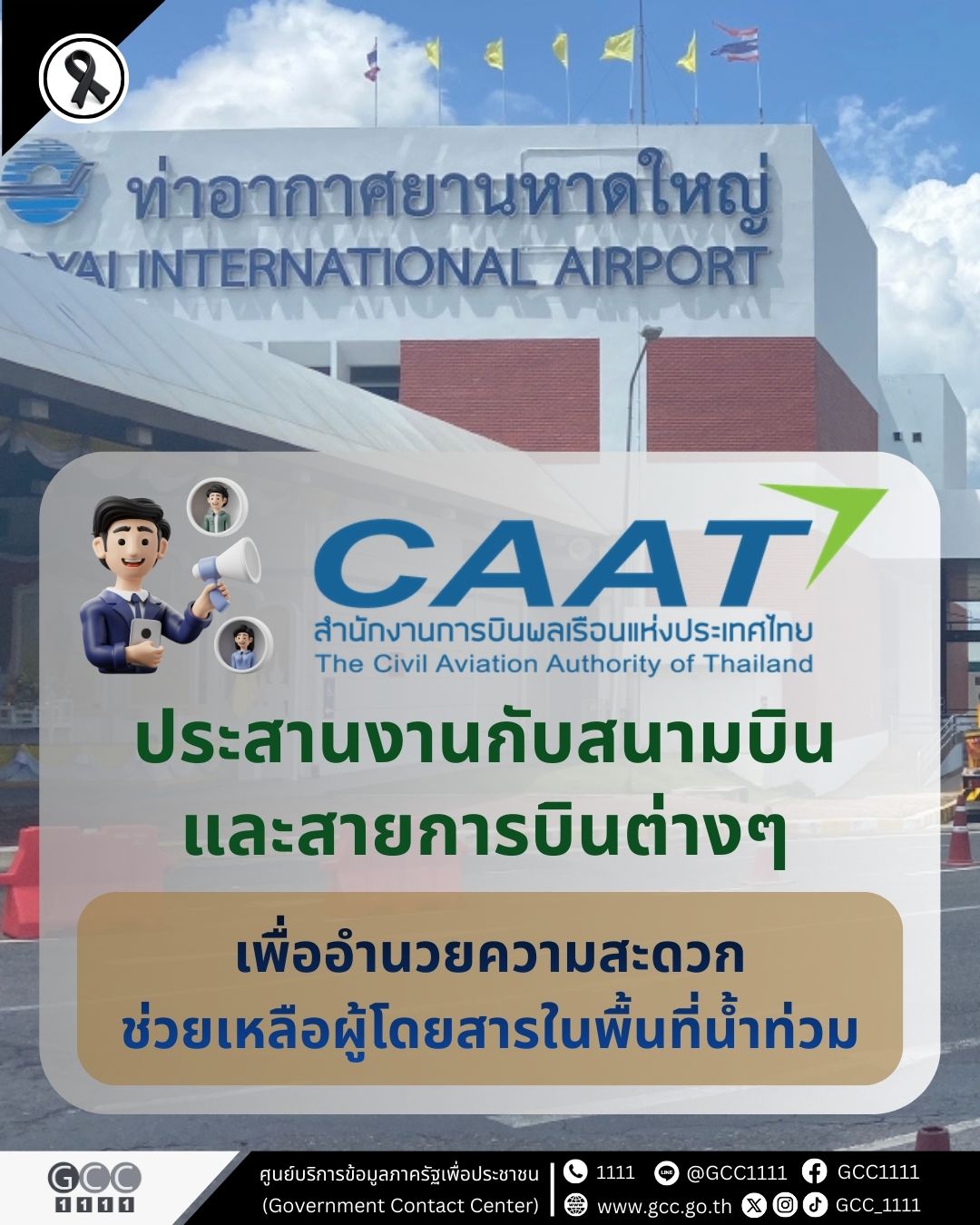 สำนักงานการบินพลเรือนแห่งประเทศไทย (CAAT) ติดตามสถานการณ์น้ำท่วมในพื้นที่ภาคใต้อย่างใกล้ชิด พร้อมประสานงานกับทุกหน่วยงานด้านการบินเพื่อให้การให้บริการของสนามบินเป็นไปอย่างปลอดภัย และลดผลกระทบที่อาจเกิดขึ้นต่อผู้โดยสารและประชาชนในพื้นที่ให้ได้มากที่สุด
