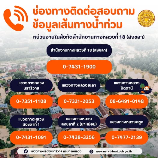กรมทางหลวง แนะนำช่องทางติดต่อสอบถามเส้นทางน้ำท่วมในพื้นที่ภาคใต้ตอนล่าง ข่าวสารกิจกรรม, สาธารณภัย กรมทางหลวง แนะนำช่องทางติดต่อสอบถามเส้นทางน้ำท่วมในพื้นที่ภาคใต้ตอนล่าง กรมทางหลวง แนะนำช่องทางติดต่อสอบถามเส้นทางน้ำท่วมในพื้นที่ภาคใต้ตอนล่าง หน่วยงานในสังกัดสำนักงานทางหลวงที่ 18 (สงขลา)สำนักงานทางหลวงที่ 18 (สงขลา) : 0-7431-1900แขวงทางหลวงนราธิวาส : 0-7351-1108แขวงทางหลวงยะลา : 0-7321-2053แขวงทางหลวงปัตตานี : 08-6491-0148แขวงทางหลวงสงขลาที่ 1 : 0-7431-1091แขวงทางหลวงสงขลาที่ 2 (นาหม่อม) : 0-7438-3256แขวงทางหลวงสตูล : 0-7477-2139ติดตามข้อมูลเพิ่มเติมได้ที่ แขวงทางหลวงนราธิวาสFacebook: Narathiwat Highway Districtเว็บไซต์: narathiwat.doh.go.th/narathiwatร้องเรียน / แจ้งเหตุ / ข้อเสนอแนะ โทร. 073-511-108 (ในวันและเวลาราชการ)สายด่วนกรมทางหลวง 1586 (โทรฟรี 24 ชั่วโมง) ที่มา : Facebook กรมประชาสัมพันธ์ Post Views: 63 FacebookFacebookXTwitterLINELine