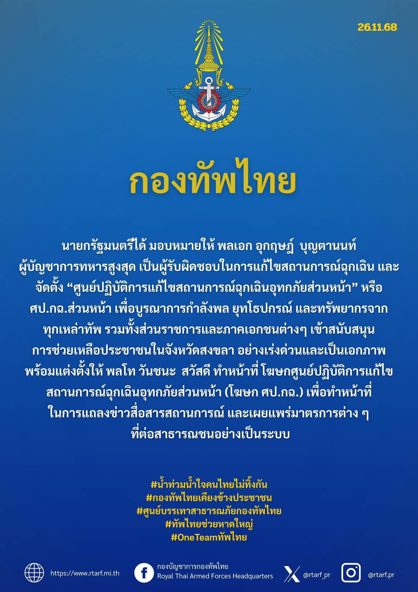 ตามที่รัฐบาลได้ประกาศสถานการณ์ฉุกเฉินในเขตท้องที่จังหวัดสงขลา ตั้งแต่วันที่ 25 พฤศจิกายน 2568 ถึงวันที่ 25 กุมภาพันธ์ 2569 เนื่องจากอุทกภัยรุนแรงจากฝนตกหนักต่อเนื่อง โดยนายกรัฐมนตรีได้มอบหมายให้ พลเอก อุกฤษฎ์ บุญตานนท์ ผู้บัญชาการทหารสูงสุด เป็นผู้รับผิดชอบในการแก้ไขสถานการณ์ฉุกเฉิน และได้มีประกาศจัดตั้ง “ศูนย์ปฏิบัติการแก้ไขสถานการณ์ฉุกเฉินอุทกภัยส่วนหน้า หรือ ศป.กฉ.ส่วนหน้า ขึ้น เพื่อบูรณาการกำลังพล ยุทโธปกรณ์ และทรัพยากรจากทุกเหล่าทัพ รวมทั้งส่วนราชการและภาคเอกชนต่างๆ เข้าสนับสนุนการช่วยเหลือประชาชนในจังหวัดสงขลาอย่างเร่งด่วนและเป็นเอกภาพ โดยศูนย์ปฏิบัติการแก้ไขสถานการณ์ฉุกเฉินอุทกภัยส่วนหน้า (ศป.กฉ.ส่วนหน้า) มีอำนาจและหน้าที่ ดังนี้