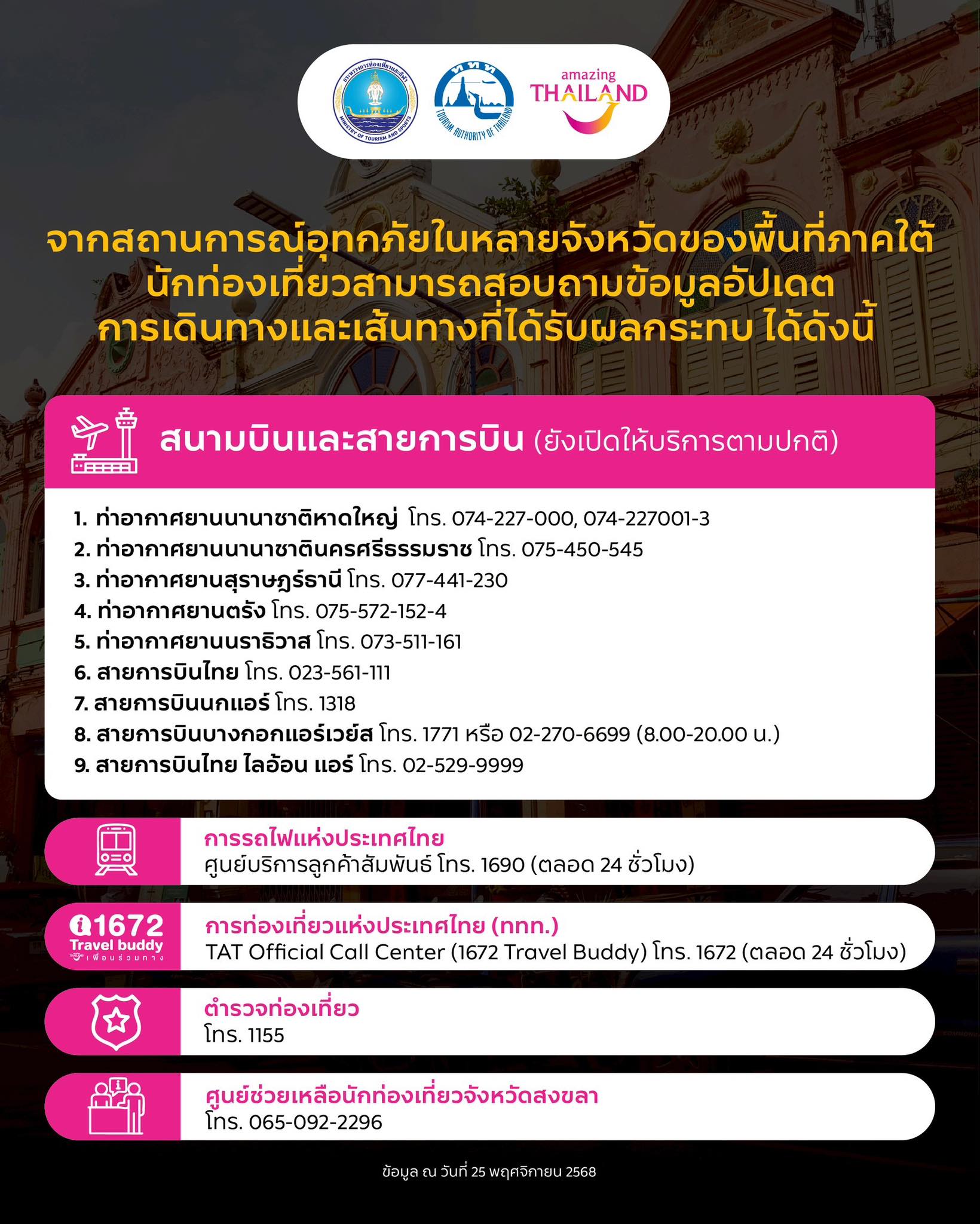 ททท. พร้อมประสานให้ความช่วยเหลือนักท่องเที่ยวที่ได้รับผลกระทบจากสถานการณ์อุทกภัยในพื้นที่ภาคใต้ ข่าวสารกิจกรรม, สาธารณภัย ททท. พร้อมประสานให้ความช่วยเหลือนักท่องเที่ยวที่ได้รับผลกระทบจากสถานการณ์อุทกภัยในพื้นที่ภาคใต้ การท่องเที่ยวแห่งประเทศไทย พร้อมประสานให้ความช่วยเหลือนักท่องเที่ยวที่ได้รับผลกระทบจากสถานการณ์อุทกภัยในพื้นที่ภาคใต้ อัปเดตการเดินทางและเส้นทางที่ได้รับผลกระทบ จากสถานการณ์อุทกภัยในหลายจังหวัดของพื้นที่ภาคใต้ นักท่องเที่ยวสามารถสอบถามข้อมูลอัปเดต การเดินทางและเส้นทางที่ได้รับผลกระทบ ได้ดังนี้สนามบินและสายการบิน (ยังเปิดให้บริการตามปกติ)ท่าอากาศยานนานาชาติหาดใหญ่ โทร. 07 4227 000, 0 7422 7001-3ท่าอากาศยานนานาชาตินครศรีธรรมราช โทร. 0 7545 0545ท่าอากาศยานสุราษฎร์ธานี โทร. 0 7744 1230ท่าอากาศยานตรัง โทร. 0 7557 2152-4ท่าอากาศยานนราธิวาส โทร. 0 7351 1161สายการบินไทย โทร. 0 2356 1111สายการบินนกแอร์ โทร. 1318สายการบินบางกอกแอร์เวย์ส โทร. 1771 หรือ 0 2270 6699 (เวลา 8.00-20.00 น.)สายการบินไทย ไลอ้อน แอร์ โทร. 0 2529 9999แนะนำหน่วยงานที่เกี่ยวข้องการรถไฟแห่งประเทศไทย ศูนย์บริการลูกค้าสัมพันธ์ โทร. 1690 (ตลอด 24 ชั่วโมง)การท่องเที่ยวแห่งประเทศไทย (ททท.) TAT Official Call Center (1672 Travel Buddy) โทร. 1672 (ตลอด 24 ชั่วโมง)ตำรวจท่องเที่ยว โทร. 1155ศูนย์ช่วยเหลือนักท่องเที่ยวจังหวัดสงขลา โทร. 06 5092 2296 ที่มา : Facebook Amazing Thailand Post Views: 10 FacebookFacebookXTwitterLINELine
