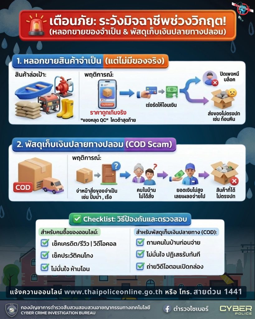 บช.สอท. เตือนประชาชนระวังมิจฉาชีพช่วงวิกฤตน้ำท่วม หลอกขายของจำเป็นและหลอกเก็บเงินปลายทาง