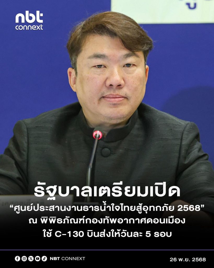 รัฐบาล เตรียมเปิด “ศูนย์ประสานงานธารน้ำใจไทยสู้อุทกภัย 2568” ณ พิพิธภัณฑ์กองทัพอากาศดอนเมือง ใช้เครื่องบิน C-130 บินขนส่งทุกความช่วยเหลือลงสู่ภาคใต้วันละ 5 รอบ