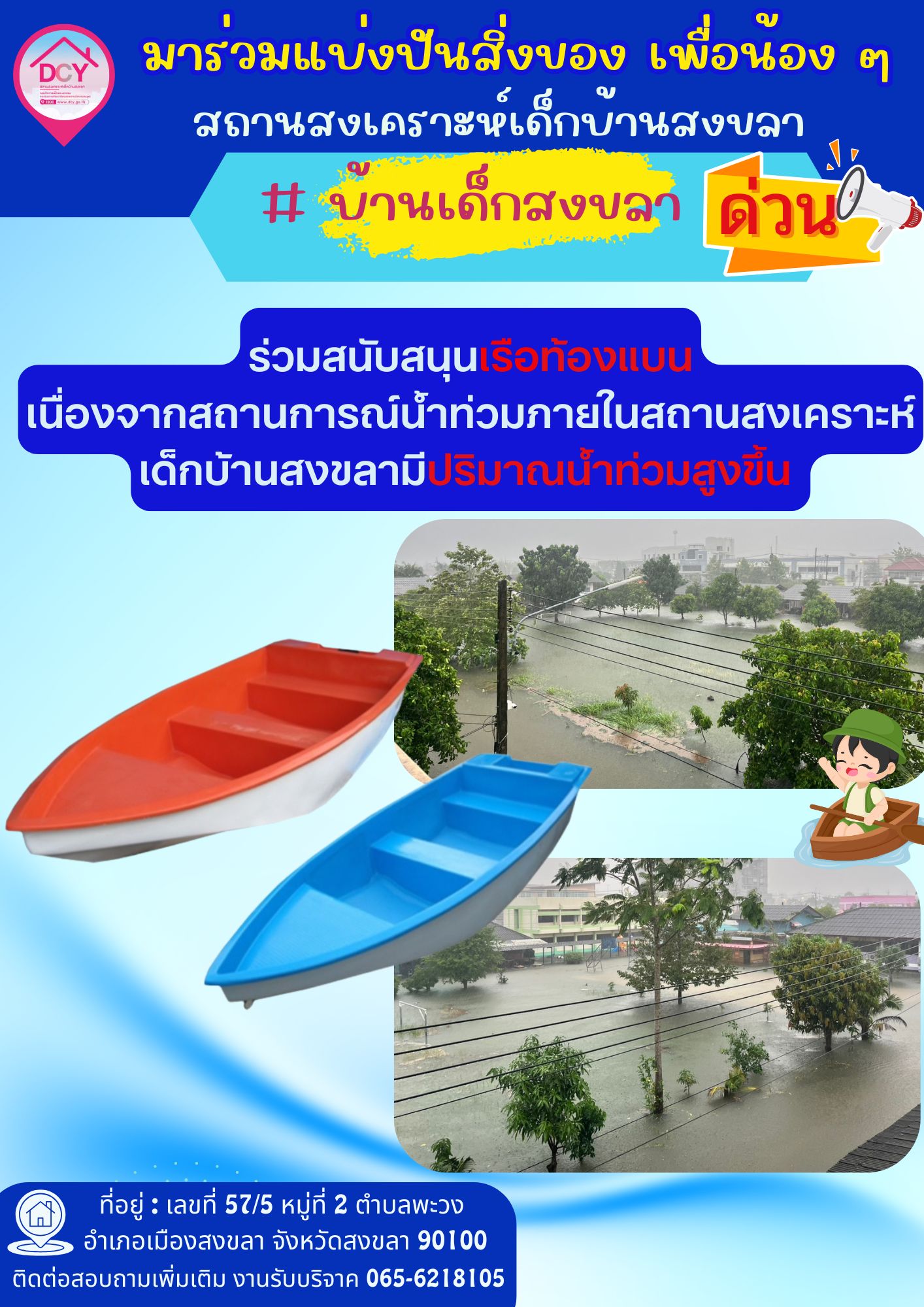 สถานสงเคราะห์เด็กบ้านสงขลา ขอเชิญชวนผู้ใหญ่ใจดีทุกท่าน ร่วมเป็นส่วนหนึ่งในการดูแลเด็กๆ โดยการแบ่งปันเรือท้องแบน เนื่องจากสถานการณ์น้ำท่วมที่มีปริมาณน้ำชึ้นอย่างต่อเนื่องและร่วมสนับสนุนน้ำสะอาด สิ่งของอุปโภค บริโภค กรณีท่านสั่งซื้อของออนไลน์ ท่านสามารถวงเล็บชื่อผู้บริจาค มาได้หลังที่อยู่ พร้อมหมายเลโทรศัพท์ของท่าน โดยทางสถานสงเคราะห์เด็กบ้านสงขลา จะดำเนินการออกใบรับสิ่งของบริจาคตามชื่อของท่าน และส่งกลับไปยังที่อยู่ของท่านค่ะ สอบถามเพิ่มเติม งานบริจาค065-6218105 เปิดบริการตั้งแต่ เวลา 08.30 – 16.30 น. เปิดทุกวันไม่เว้นวันหยุดราชการ