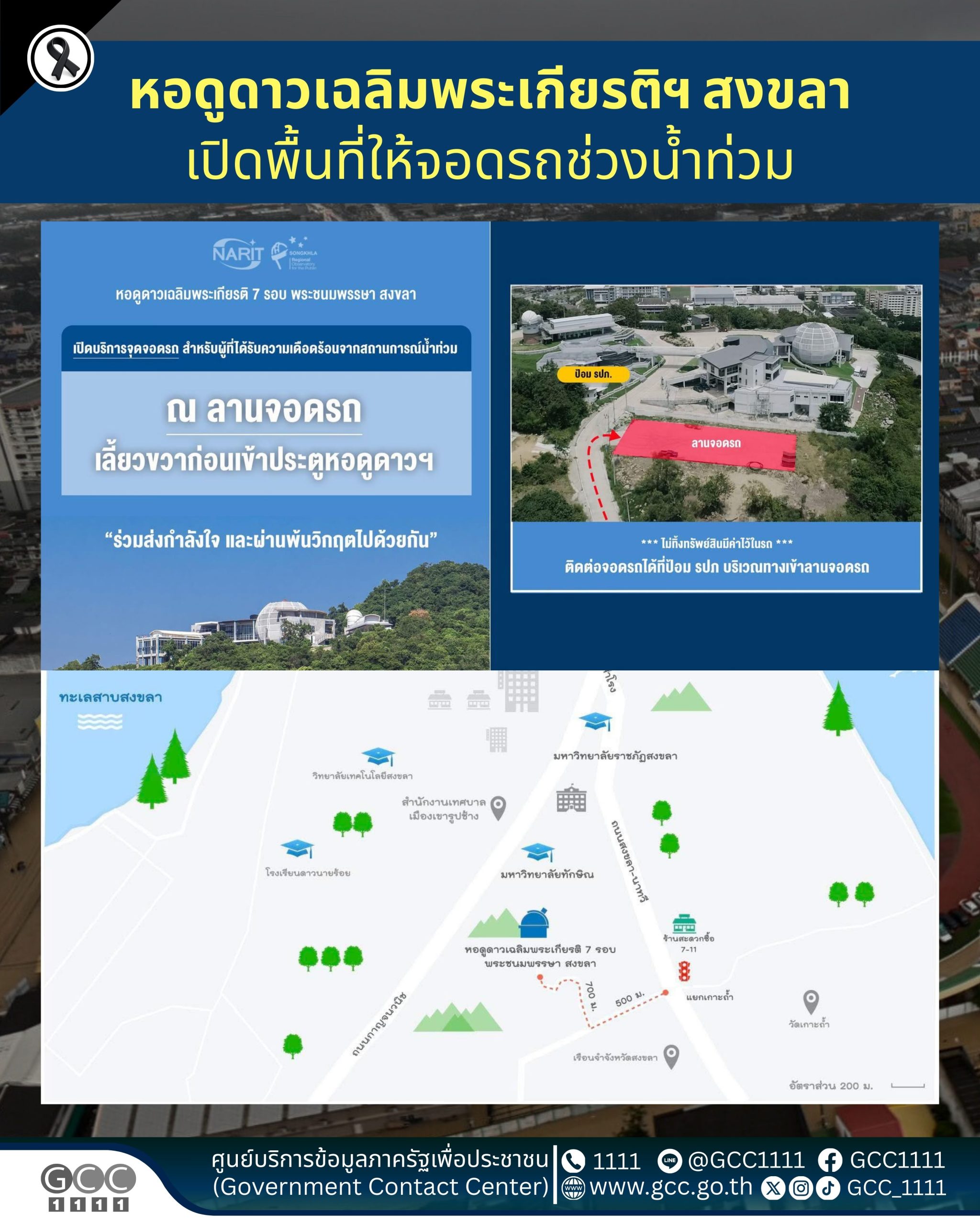 หอดูดาวเฉลิมพระเกียรติฯ สงขลา เปิดให้บริการพื้นที่จอดรถช่วงน้ำท่วม ข่าวสารกิจกรรม, สาธารณภัย, ไม่มีหมวดหมู่ หอดูดาวเฉลิมพระเกียรติฯ สงขลา เปิดให้บริการพื้นที่จอดรถช่วงน้ำท่วม หอดูดาวเฉลิมพระเกียรติฯ สงขลา ต. เขารูปช้าง อ. เมือง จ. สงขลา เปิดให้บริการพื้นที่จอดรถ บริเวณลานจอดรถของหอดูดาวฯ สำหรับผู้ที่ได้รับความเดือดร้อนจากสถานการณ์น้ำท่วม โดยให้เลี้ยวขวาก่อนประตูทางเข้าหอดูดาว และขอความกรุณาไม่ทิ้งทรัพย์สินมีค่าไว้ในรถ ที่มา : Facebook : NARIT สถาบันวิจัยดาราศาสตร์แห่งชาติ Post Views: 15 FacebookFacebookXTwitterLINELine