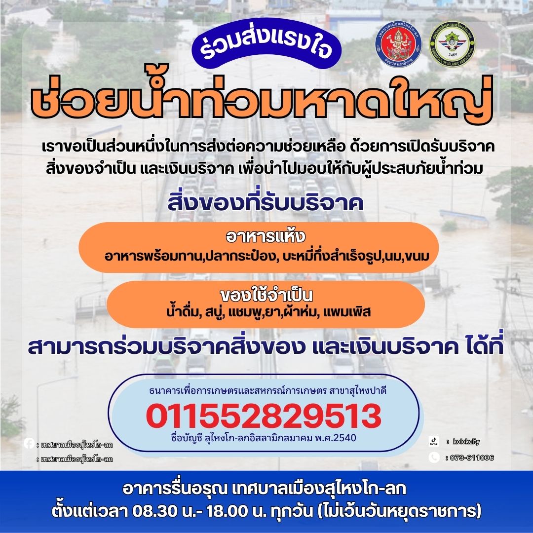 เทศบาลเมืองสุไหงโก-ลก ร่วมกับสมาคมอิสลามฯ เปิดรับบริจาคช่วยเหลือผู้ประสบอุทกภัยในพื้นที่อำเภอหาดใหญ่ ข่าวสารกิจกรรม, สาธารณภัย เทศบาลเมืองสุไหงโก-ลก ร่วมกับสมาคมอิสลามฯ เปิดรับบริจาคช่วยเหลือผู้ประสบอุทกภัยในพื้นที่อำเภอหาดใหญ่ เนื่องจากเกิดสถานการณ์น้ำท่วมในพื้นที่อำเภอหาดใหญ่ ส่งผลให้ประชาชนจำนวนมากได้รับผลกระทบและประสบความเดือดร้อน ทางเทศบาลเมืองสุไหงโก-ลก พร้อมด้วยสมาคมอิสลามสุไหงโก-ลก ขอเป็นส่วนหนึ่งในการส่งต่อความช่วยเหลือแก่ผู้ประสบอุทกภัยครั้งนี้ เพื่อสนับสนุนการบรรเทาความเดือดร้อน จึงเปิดรับบริจาคสิ่งของจำเป็น ดังนี้สิ่งของที่รับบริจาคอาหารแห้งอาหารพร้อมทานปลากระป๋องบะหมี่กึ่งสำเร็จรูปนมขนมของใช้จำเป็นน้ำดื่มสบู่แชมพูยาผ้าเช็ดตัวแพมเพิสสามารถนำสิ่งของบริจาคได้ที่อาคารรื่นอรุณ เทศบาลเมืองสุไหงโก-ลกตั้งแต่เวลา 08.30 – 18.00 น. ทุกวัน (ไม่เว้นวันหยุดราชการ)บริจาคเงินช่วยเหลือได้ที่ธนาคารเพื่อการเกษตรและสหกรณ์การเกษตร สาขาสุไหงปาดีเลขที่บัญชี 011552829513ชื่อบัญชี สุไหงโก-ลกอิสลามิกสมาคม พ.ศ.2540 ที่มา : Facebook : เทศบาลเมืองสุไหงโก-ลก Post Views: 15 FacebookFacebookXTwitterLINELine
