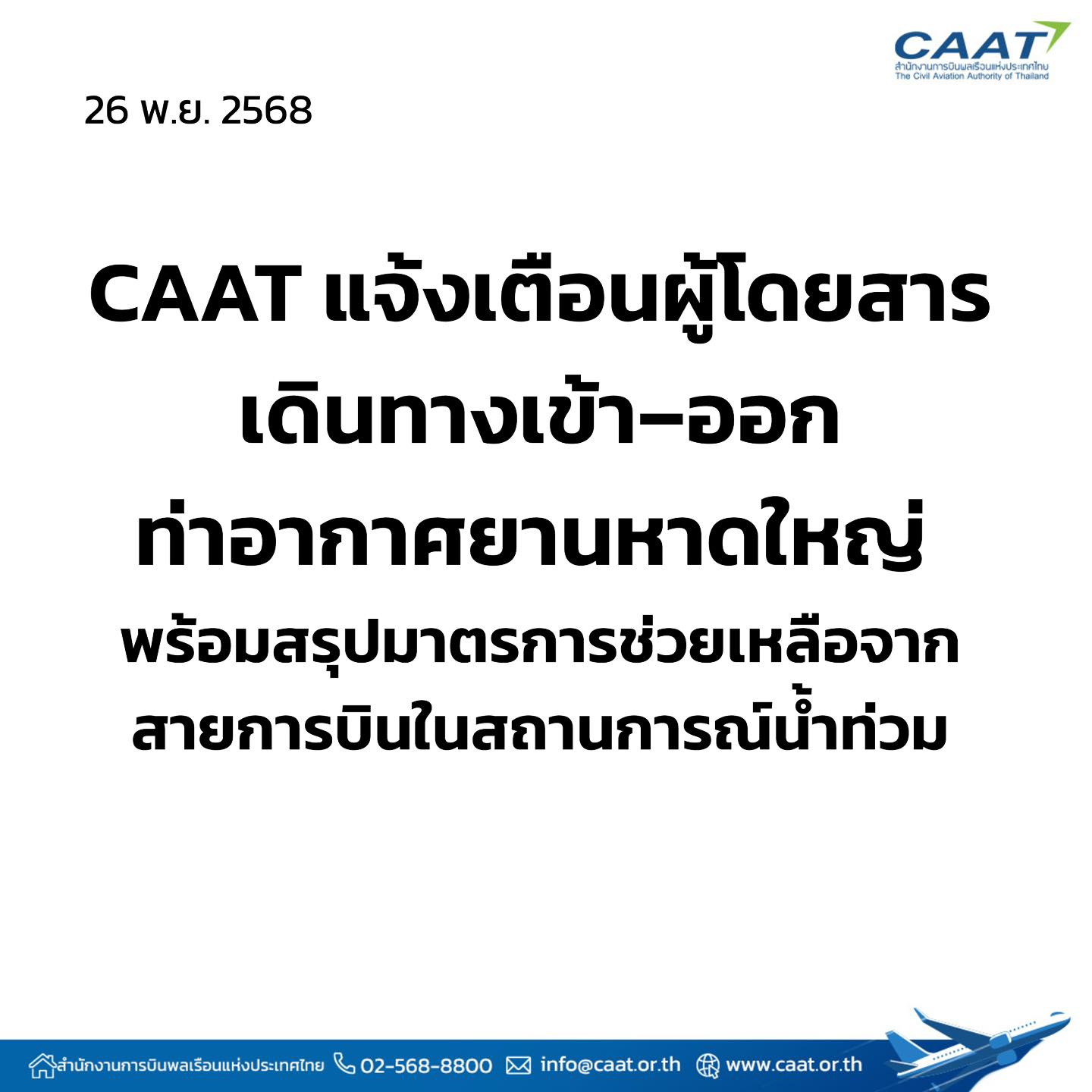 CAAT แจ้งเตือนผู้โดยสารเดินทางเข้า–ออกท่าอากาศยานหาดใหญ่ พร้อมสรุปมาตรการช่วยเหลือจากสายการบินในสถานการณ์น้ำท่วม จากสถานการณ์น้ำท่วมในพื้นที่ อำเภอหาดใหญ่ จังหวัดสงขลา ซึ่งยังมีระดับน้ำสูงในหลายจุด ส่งผลให้การเดินทางเข้า–ออกท่าอากาศยานหาดใหญ่อาจประสบความลำบาก โดยเฉพาะรถรับ–ส่งผู้โดยสารของหน่วยงานรัฐที่จัดไว้ ซึ่งอาจไม่สามารถให้บริการได้ในบางช่วงเวลา ทำให้ผู้โดยสารอาจได้รับผลกระทบด้านความสะดวกในการเดินทาง CAAT ขอความร่วมมือผู้โดยสารพิจารณาความจำเป็นในการเดินทางในช่วงที่สถานการณ์น้ำยังไม่เสถียร หากต้องเดินทางไปหาดใหญ่ ควรมีผู้มารับที่สนามบินได้อย่างแน่นอน หากต้องเดินทางออกจากหาดใหญ่ให้เผื่อเวลาเดินทางไปสนามบินเพิ่มขึ้นอย่างมากเนื่องจากเส้นทางบางช่วงยังมีน้ำท่วม ทั้งนี้ โปรดติดตามสถานการณ์ล่าสุดจากสายการบิน เพื่อหลีกเลี่ยงการตกค้างในสนามบิน ซึ่งอาจมีข้อจำกัดด้านอาหาร น้ำดื่ม และพื้นที่พักคอย