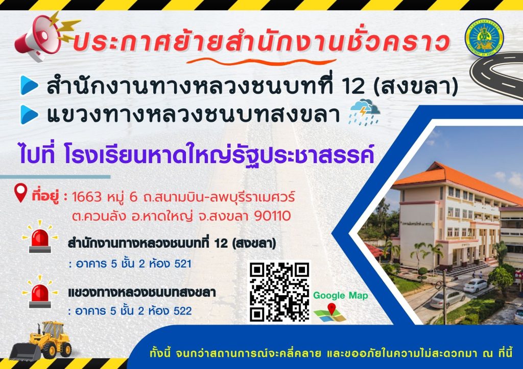 กรมทางหลวงชนบท ประกาศย้ายสำนักงานทางหลวงชนบทที่ 12 (สงขลา)และแขวงทางหลวงชนบทสงขลา เป็นการชั่วคราว