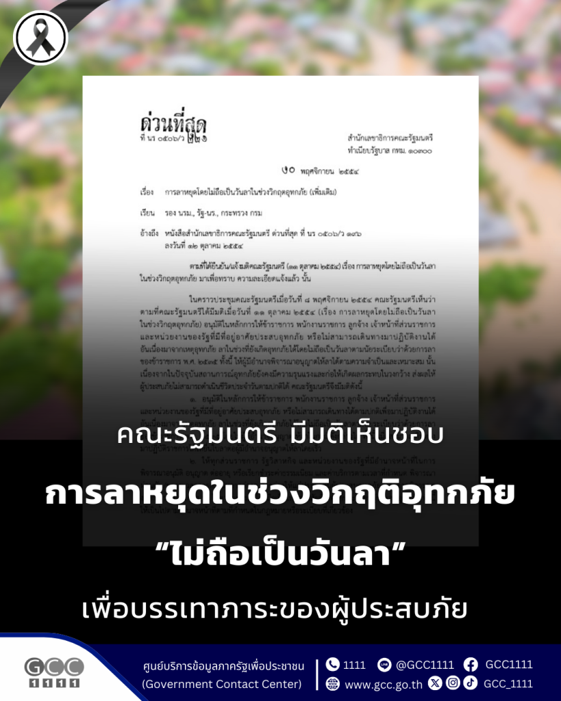 ครม. เห็นชอบ “ลาหยุดช่วงวิกฤติอุทกภัยไม่ถือเป็นวันลา” ช่วยเหลือผู้ประสบอุทกภัย