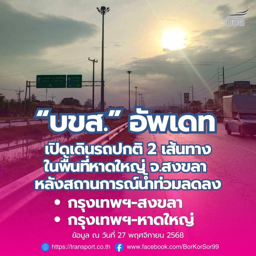 วันนี้ (27 พฤศจิกายน 2568) เวลา 15.00 น. บริษัท ขนส่ง จำกัด (บขส.) รายงานสถานการณ์น้ำท่วมในพื้นที่ภาคใต้ว่า ขณะนี้ระดับน้ำในพื้นที่ อ.หาดใหญ่ จ.สงขลา เริ่มลดลง รถโดยสารสามารถวิ่งเข้าสถานีขนส่งผู้โดยสาร และใช้เส้นทางเดินรถได้ตามปกติ บริษัท ขนส่ง จำกัด จึงได้เปิดเดินรถโดยสารในพื้นที่ภาคใต้ จำนวน 2 เส้นทางตามปกติ ได้แก่