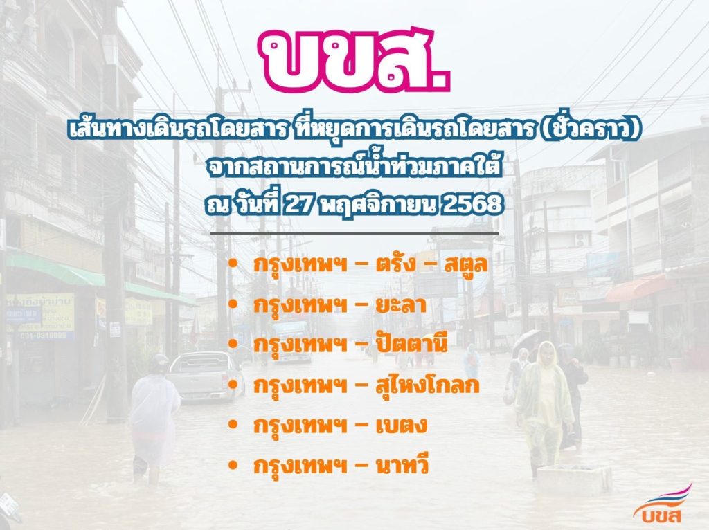 ขณะเดียวกันในพื้นที่ยังมีน้ำท่วมสูง รถยังไม่สามารถผ่านได้ บขส. จึงปิดเดินรถชั่วคราว 4 เส้นทาง ได้แก่