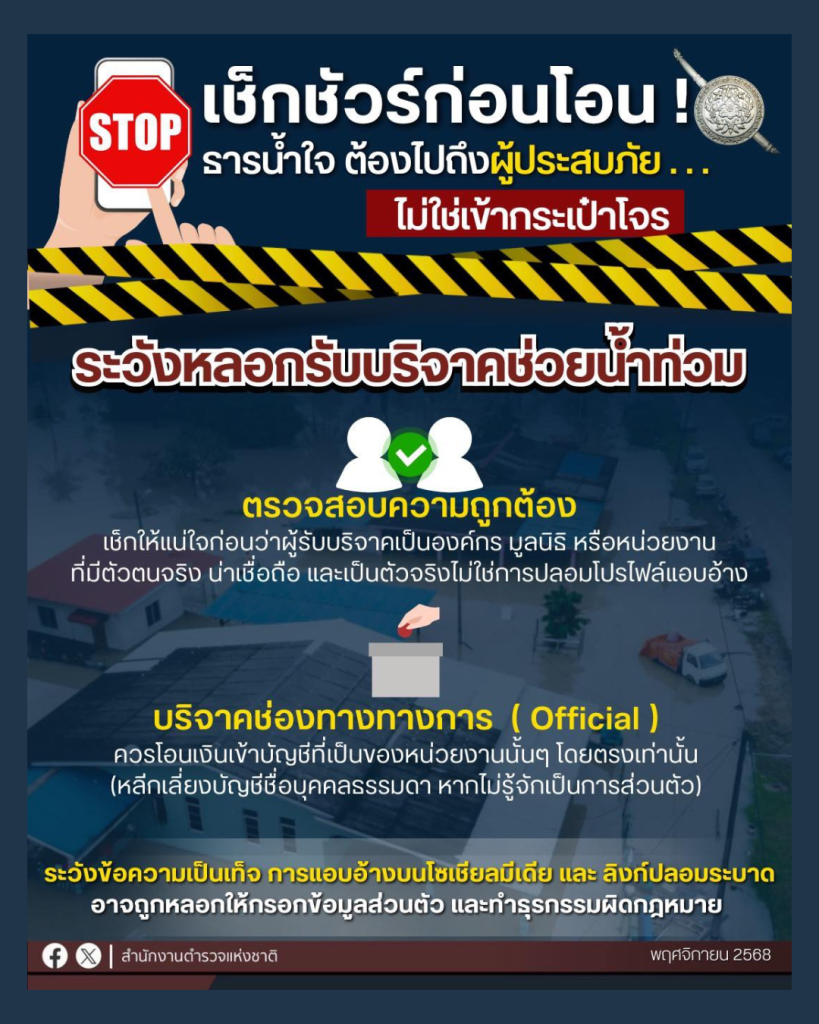 สำนักงานตำรวจแห่งชาติ เตือนระวังมิจฉาชีพหลอกรับบริจาคช่วยน้ำท่วม เช็กชัวร์ก่อนโอน โจรหรือคนดี ธารน้ำใจต้องไปถึงผู้ประสบภัย ไม่ใช่เข้ากระเป๋ามิจฉาชีพ
