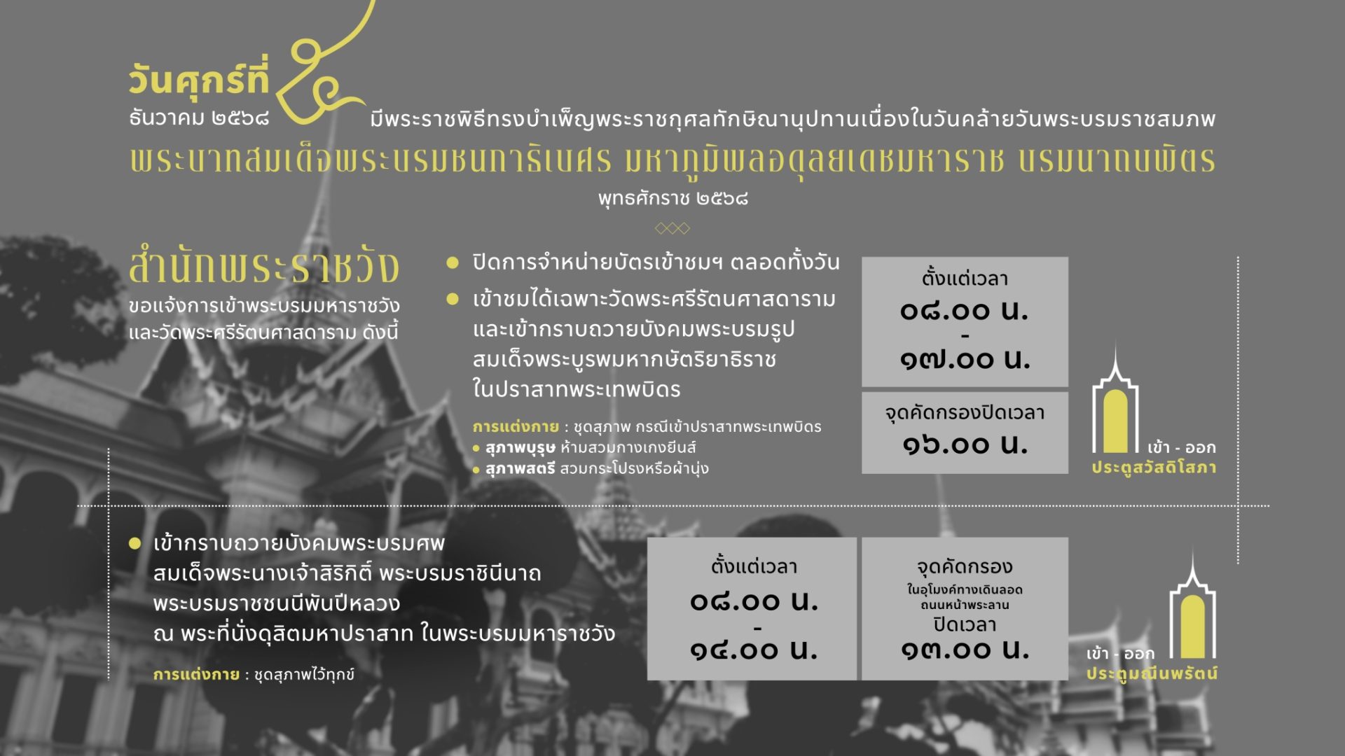 สำนักพระราชวัง ขอแจ้งการเข้าชมพระบรมมหาราชวังและวัดพระศรีรัตนศาสดาราม ในวันศุกร์ที่ 5 ธันวาคม 2568 เนื่องจากมีพระราชพิธีทรงบำเพ็ญพระราชกุศลทักษิณานุปทาน เนื่องในวันคล้ายวันพระบรมราชสมภพ พระบาทสมเด็จพระบรมชนกาธิเบศร มหาภูมิพลอดุลยเดชมหาราช บรมนาถบพิตร พุทธศักราช 2568