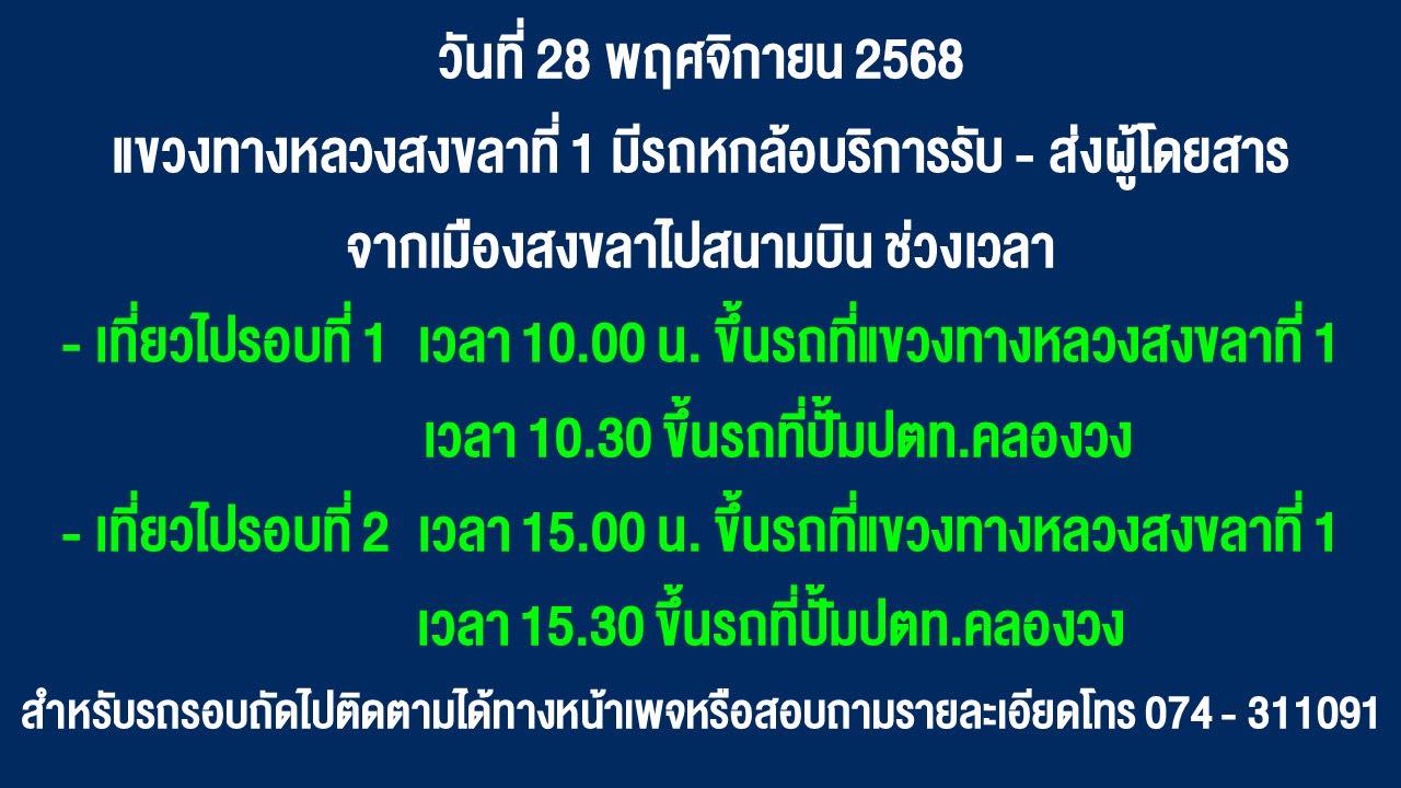 แขวงทางหลวงสงขลาที่ 1 แจ้งรถรับส่งผู้โดยสาร จากเมืองสงขลาไปสนามบิน วันที่ 28 พฤศจิกายน 2568 ข่าวสารกิจกรรม, สาธารณภัย แขวงทางหลวงสงขลาที่ 1 แจ้งรถรับส่งผู้โดยสาร จากเมืองสงขลาไปสนามบิน วันที่ 28 พฤศจิกายน 2568 แขวงทางหลวงสงขลาที่ 1 แจ้งว่ามีรถหกล้อบริการรับ – ส่งผู้โดยสาร จากเมืองสงขลาไปสนามบินในวันที่ 28 พฤศจิกายน 2568 ช่วงเวลา ดังนี้ เที่ยวไปรอบที่ 1 เวลา 10.00 น. ขึ้นรถที่แขวงทางหลวงสงขลาที่ 1 เวลา 10.30 ขึ้นรถที่ปั๊มปตท.คลองวงเที่ยวไปรอบที่ 2 เวลา 15.00 น. ขึ้นรถที่แขวงทางหลวงสงขลาที่ 1 เวลา 15.30 ขึ้นรถที่ปั๊มปตท.คลองวงสำหรับรถรอบถัดไปติดตามได้ทางหน้าเพจหรือสอบถามรายละเอียด โทร. 0 7431 1091 ที่มา : Facebook แขวงทางหลวงสงขลาที่ 1 Post Views: 15 FacebookFacebookXTwitterLINELine