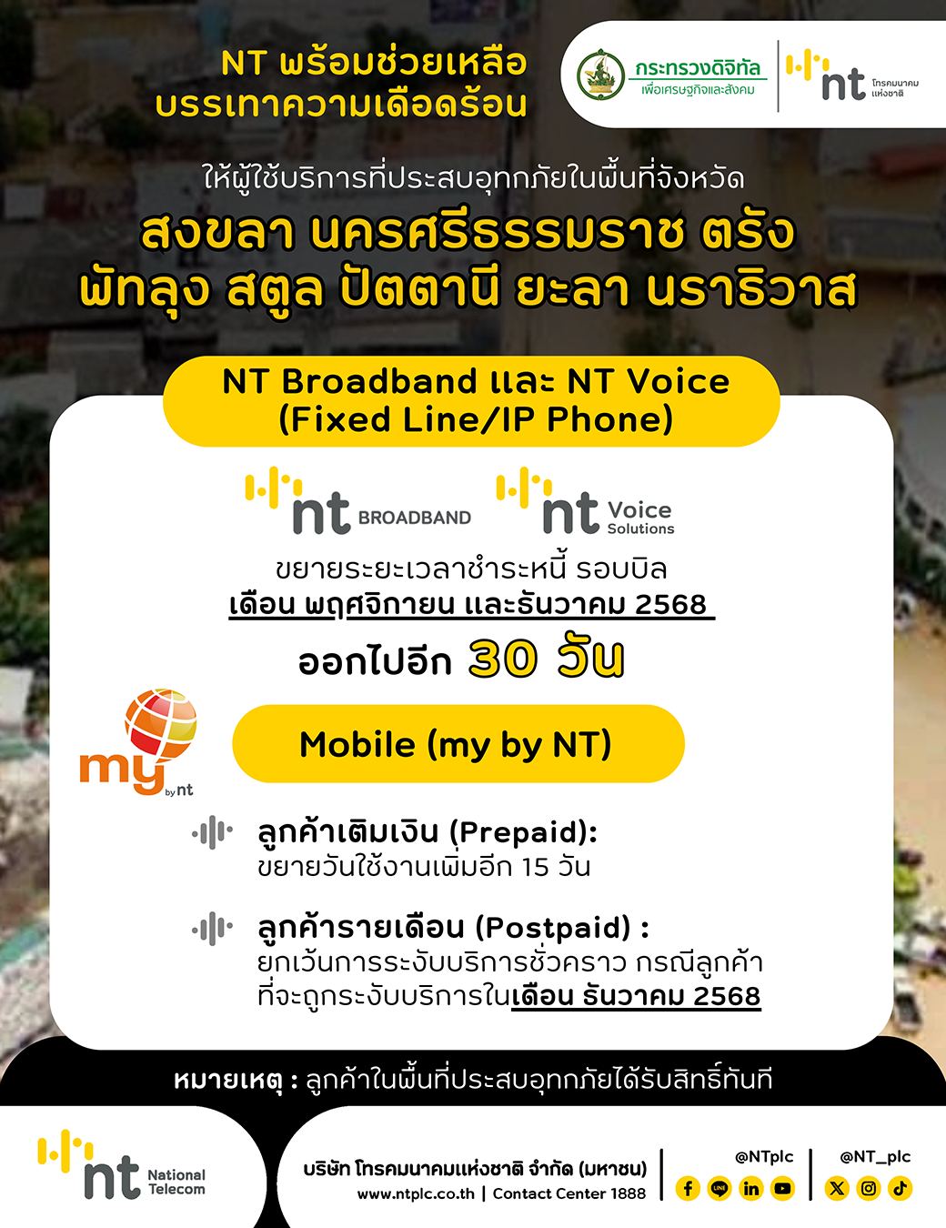 NT พร้อมช่วยเหลือบรรเทาความเดือดร้อน ให้ผู้ใช้บริการที่ประสบอุทกภัยภาคใต้ ข่าวสารกิจกรรม, สาธารณภัย NT พร้อมช่วยเหลือบรรเทาความเดือดร้อน ให้ผู้ใช้บริการที่ประสบอุทกภัยภาคใต้ บริษัท โทรคมนาคมแห่งชาติ จำกัด (มหาชน) พร้อมช่วยเหลือบรรเทาความเดือดร้อน ให้ผู้ใช้บริการที่ประสบอุทกภัยในพื้นที่ จังหวัดสงขลา นครศรีธรรมราช ตรัง พัทลุง สตูล ปัตตานี ยะลา และนราธิวาส บริษัท โทรคมนาคมแห่งชาติ จำกัด (มหาชน) พร้อมช่วยเหลือบรรเทาความเดือดร้อน ให้ผู้ใช้บริการที่ประสบอุทกภัยในพื้นที่ จังหวัดสงขลา นครศรีธรรมราช ตรัง พัทลุง สตูล ปัตตานี ยะลา และนราธิวาส ลูกค้าในพื้นที่ประสบอุทกภัยได้รับสิทธิ์ทันทีNT Broadband และ NT Voice (Fixed Line/IP Phone)จะได้รับการขยายระยะเวลาชำระหนี้ รอบบิลเดือน พฤศจิกายน และธันวาคม 2568Mobile (my by NT)บริการเติมเงิน (Prepaid) : ขยายวันใช้งานเพิ่มอีก 15 วันบริการรายเดือน (Postpaid) : ยกเว้นการระงับชั่วคราว กรณีลูกค้าที่จะถูกระงับบริการในเดือน ธันวาคม 2568 สอบถามรายละเอียดเพิ่มเติมได้ที่ Contact Center 1888 ที่มา : Facebook NTPLC Post Views: 24 FacebookFacebookXTwitterLINELine