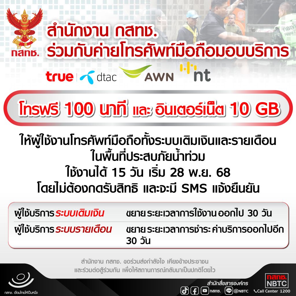 กสทช. และ โอเปอเรเตอร์ มอบโทรฟรี 100 นาที เน็ต 10GB ช่วยผู้ประสบภัยน้ำท่วม มีผลทันที ข่าวสารกิจกรรม, สาธารณภัย กสทช. และ โอเปอเรเตอร์ มอบโทรฟรี 100 นาที เน็ต 10GB ช่วยผู้ประสบภัยน้ำท่วม มีผลทันที สำนักงาน กสทช. ร่วมกับผู้ให้บริการโทรศัพท์เคลื่อนที่ทุกค่าย ออกมาตรการช่วยเหลือผู้ใช้บริการในพื้นที่ประสบอุทกภัย โดยให้สิทธิใช้งานโทรฟรี 100 นาที และอินเทอร์เน็ต 10 GB เป็นเวลา 15 วัน ตั้งแต่วันที่ 28 พฤศจิกายน 2568 สำนักงาน กสทช. ร่วมกับค่ายโทรศัพท์มือถือ! มอบบริการโทรฟรี 100 นาทีและอินเตอร์เน็ต 10 GB ให้ผู้ใช้งานโทรศัพท์มือถือทั้งระบบเติมเงินและรายเดือนในพื้นที่ประสบภัยน้ำท่วม ใช้งานได้ 15 วัน เริ่มตั้งแต่ 28 พ.ย. 68 โดยไม่ต้องกดรับสิทธิ และจะมี SMS แจ้งยืนยันผู้ใช้บริการระบบเติมเงิน ขยายระยะเวลาการใช้งานออกไป 30 วันผู้ใช้บริการระบบรายเดือน ขยายระยะเวลาชำระค่าบริการออกไปอีก 30 วัน สำนักงาน กสทช. ขอร่วมส่งกำลังใจ เคียงข้างประชาชน และร่วมต่อสู้ร่วมกัน เพื่อให้สถานการณ์กลับมาเป็นปกติโดยไว ที่มา : Facebook กสทช. Post Views: 105 FacebookFacebookXTwitterLINELine