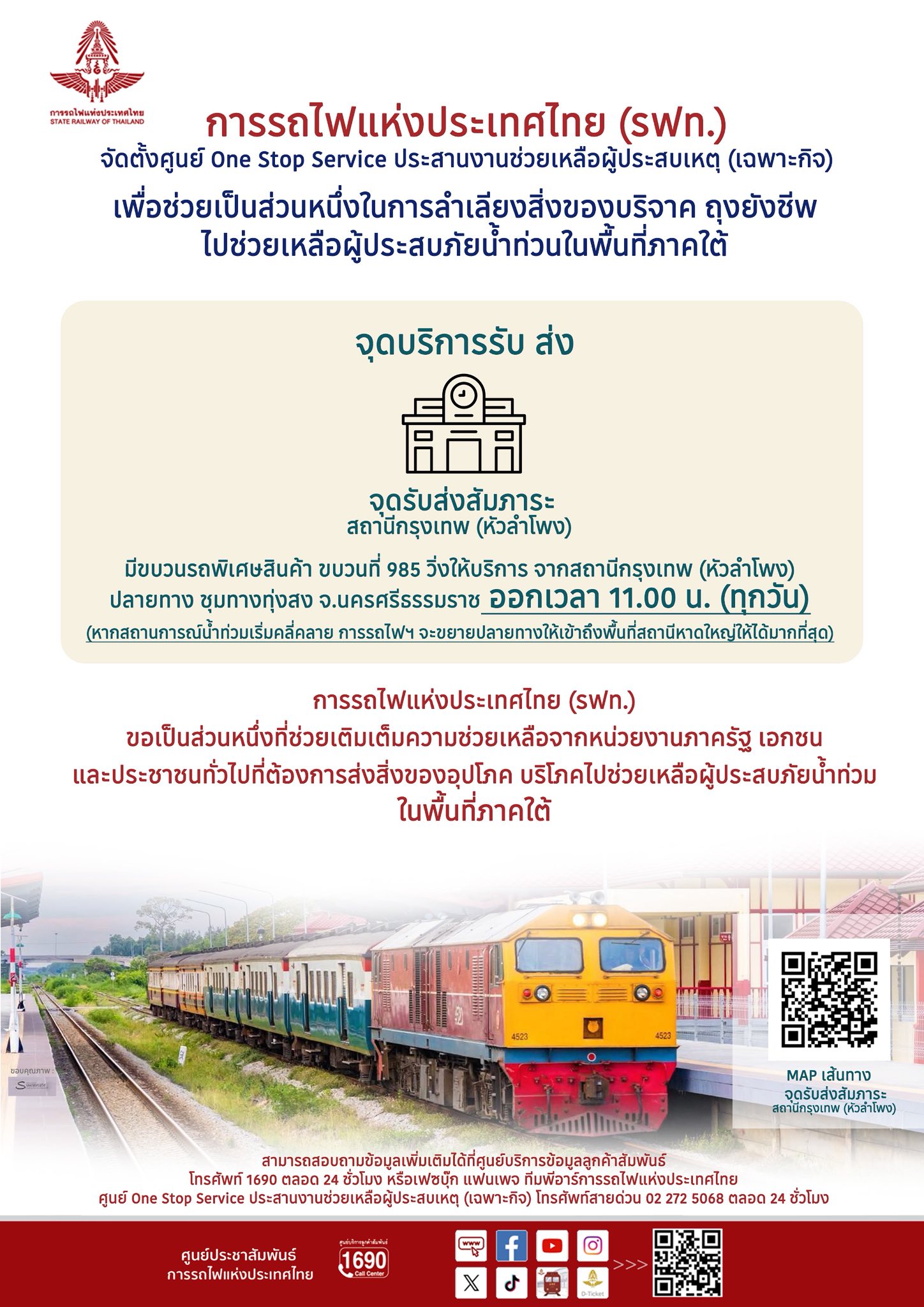 การรถไฟแห่งประเทศไทย เคลื่อนขบวนจัดตั้ง “ศูนย์รวมน้ำใจ เพื่อบรรเทาภัยน้ำท่วมภาคใต้” เพื่อเป็นศูนย์กลางรับบริจาคสิ่งของอุปโภคบริโภคและของใช้จำเป็น สำหรับช่วยเหลือผู้ที่ได้รับผลกระทบจากสถานการณ์อุทกภัยในพื้นที่ภาคใต้ เปิดรับบริจาคตั้งแต่บัดนี้เป็นต้นไป ในวันและเวลาราชการ เวลา 08.30 – 16.30 น. ณ สถานีกรุงเทพ (หัวลำโพง) บริเวณจุดรับ-ส่ง สัมภาระ โดยลำเลียงสิ่งของไปกับขบวนรถสินค้าห่อวัตถุด่วนที่ 985 ออกจากสถานีกรุงเทพ (หัวลำโพง) – ชุมทางทุ่งสง เวลา 11.00 น. ของทุกวัน