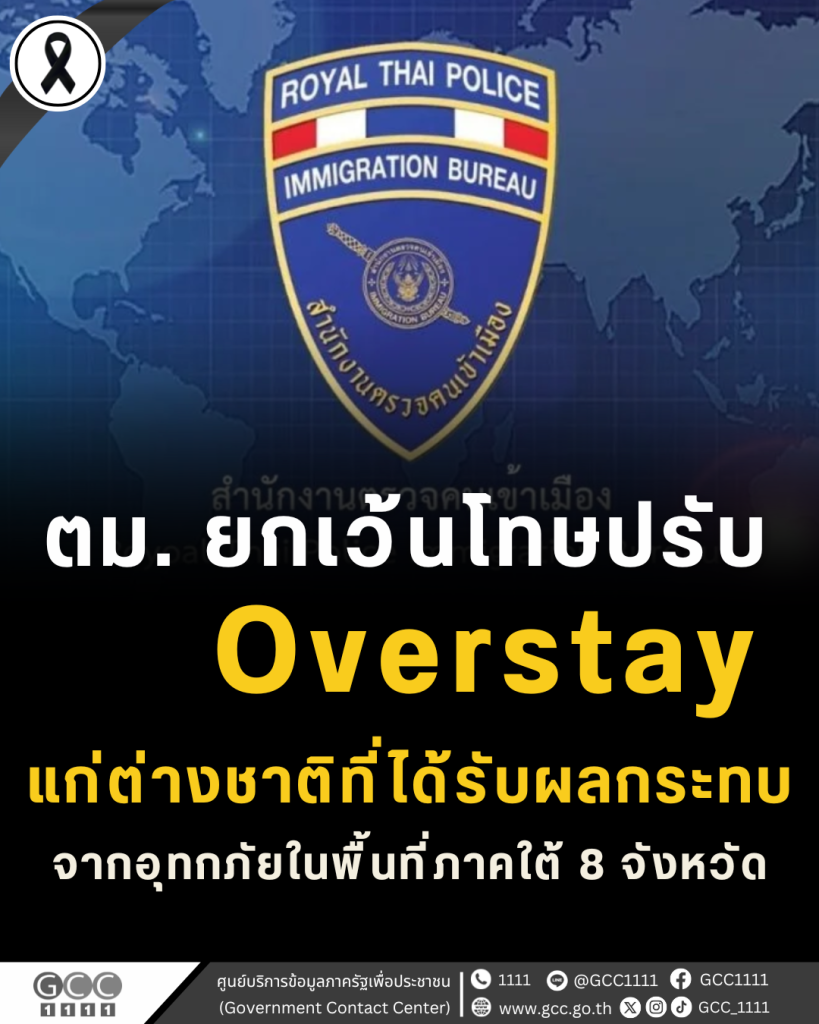 สำนักงานตรวจคนเข้าเมือง มีคำสั่งให้ยกเว้นการเปรียบเทียบปรับกรณีอยู่เกินกำหนดอนุญาต (overstay) สำหรับชาวต่างชาติที่ประสงค์เดินทางออกนอกประเทศ แต่ติดเหตุอุทกภัยใน 8 จังหวัด ให้มีผลตั้งแต่วันที่ 20 พฤศจิกายน – 31 ธันวาคม 2568