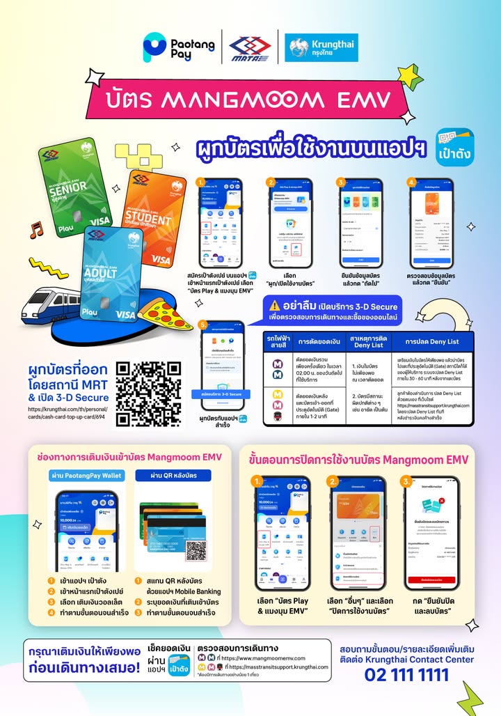 - ไม่ต้องลงทะเบียนบัตรโดยสาร ยกเว้น บัตร MANGMOOM EMV หรือ MRT EMV ที่ซื้อใหม่ หรือใช้งานครั้งแรก จำเป็นต้องลงทะเบียนผ่านเว็บไซต์ www.mangmoomemv.com ก่อนเริ่มใช้งาน