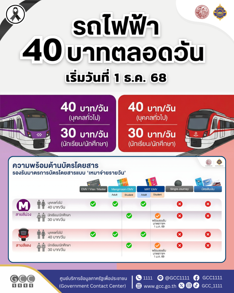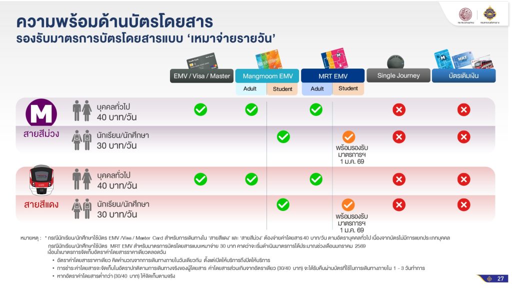 - บัตร MRT EMV ประเภทนักเรียน/นักศึกษา จะสามารถใช้อัตราค่าโดยสารสูงสุด 30 บาทต่อวัน ได้ตั้งแต่วันที่ 1 มกราคม 2569 เป็นต้นไป