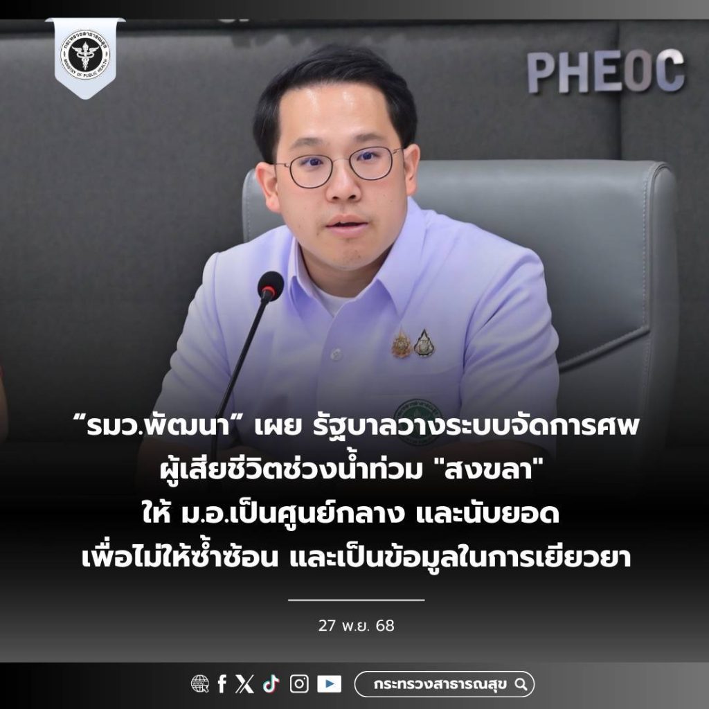 รัฐบาล ให้โรงพยาบาลสงขลานครินทร์ มหาวิทยาลัยสงขลานครินทร์ (ม.อ.) เป็นศูนย์รับศพน้ำท่วม ข่าวสารกิจกรรม, สาธารณภัย รัฐบาล ให้โรงพยาบาลสงขลานครินทร์ มหาวิทยาลัยสงขลานครินทร์ (ม.อ.) เป็นศูนย์รับศพน้ำท่วม รัฐบาล มอบหมายให้โรงพยาบาลสงขลานครินทร์ มหาวิทยาลัยสงขลานครินทร์ (ม.อ.) ทำหน้าที่เป็นศูนย์กลางรับศพที่ทีมกู้ภัยนำส่ง เพื่อบันทึกข้อมูลผู้เสียชีวิตอย่างเป็นระบบ ป้องกันการซ้ำซ้อน และใช้เป็นข้อมูลสำหรับกระบวนการเยียวยาของภาครัฐ วันนี้ (27 พฤศจิกายน 2568) นายพัฒนา พร้อมพัฒน์ รัฐมนตรีว่าการกระทรวงสาธารณสุข กล่าวว่าหลังจากน้ำเริ่มลด ทีมกู้ภัยซึ่งเป็นจิตอาสาจากหลายหน่วยงานจะสามารถเข้าพื้นที่ได้ และมีโอกาสที่จะพบร่างผู้เสียชีวิตในที่ต่างๆ เพิ่มขึ้น รัฐบาลจึงได้ วางระบบบริหารจัดการศพผู้เสียชีวิตในช่วงที่เกิดสถานการณ์น้ำท่วม ทั้งที่เสียชีวิตโดยตรงจากเหตุการณ์และเสียชีวิตจากเหตุอื่นๆ โดยมอบหมายให้โรงพยาบาลสงขลานครินทร์ มหาวิทยาลัยสงขลานครินทร์ (ม.อ.) เป็นศูนย์กลางในการรับศพ ที่กู้ภัยนำส่ง เพื่อบันทึกรายละเอียดข้อมูลของผู้เสียชีวิต ไม่ให้เกิดความซ้ำซ้อน รวมถึงจะเป็นข้อมูลที่ใช้สำหรับรัฐบาลในการเยียวยาตามกระบวนการ ดังนั้นขอให้ทีมกู้ภัยที่เข้าพื้นที่แล้วพบศพดำเนินการตามแนวทางดังกล่าวต่อไป ที่มา : เว็บไซต์รัฐบาลไทย Post Views: 12 FacebookFacebookXTwitterLINELine