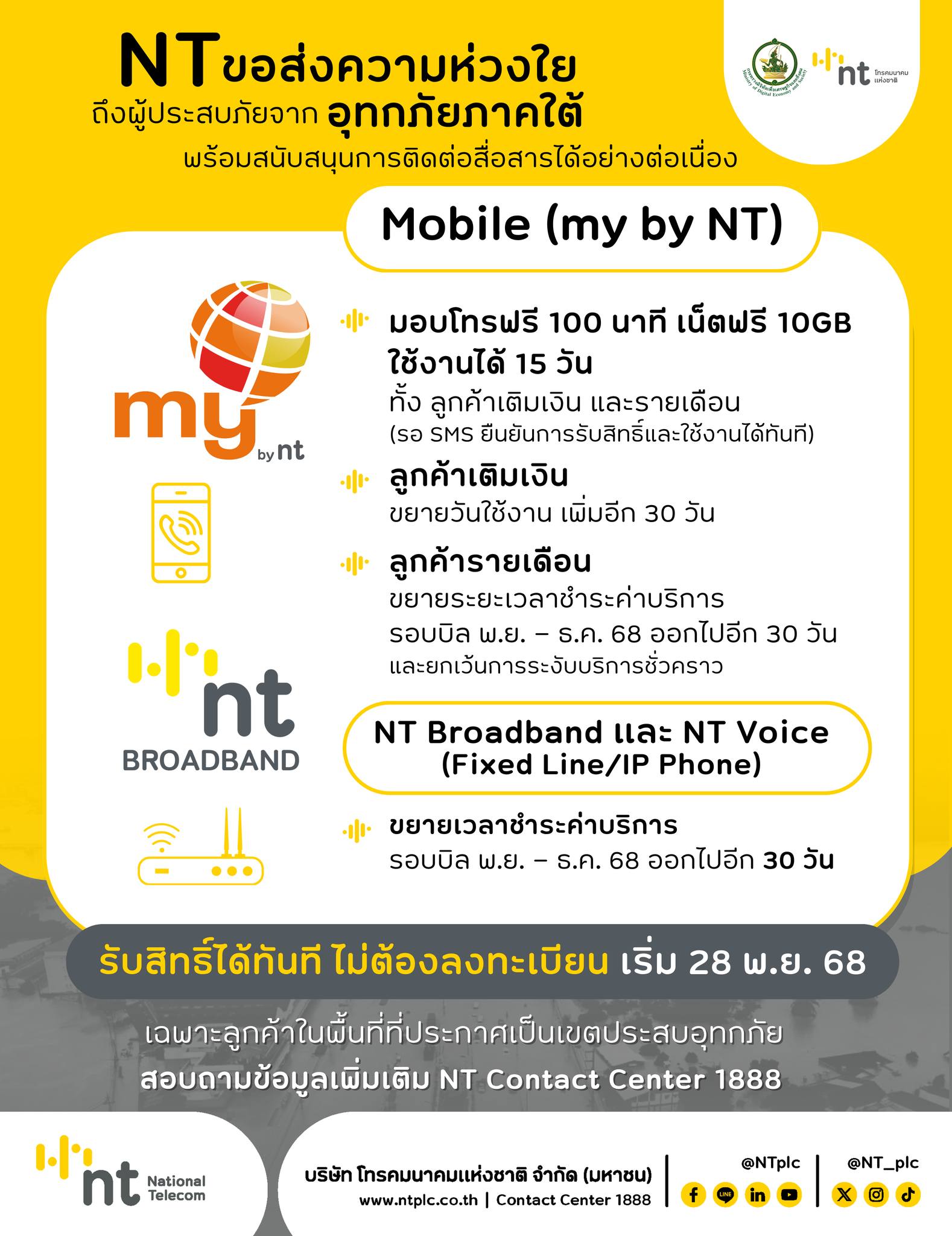 บริษัท โทรคมนาคมแห่งชาติ จำกัด (มหาชน) ห่วงใยผู้ประสบอุทกภัยภาคใต้ มอบโทรฟรี–เน็ตฟรี พร้อมขยายเวลาชำระค่าบริการเพื่อการสื่อสารที่ไม่สะดุด