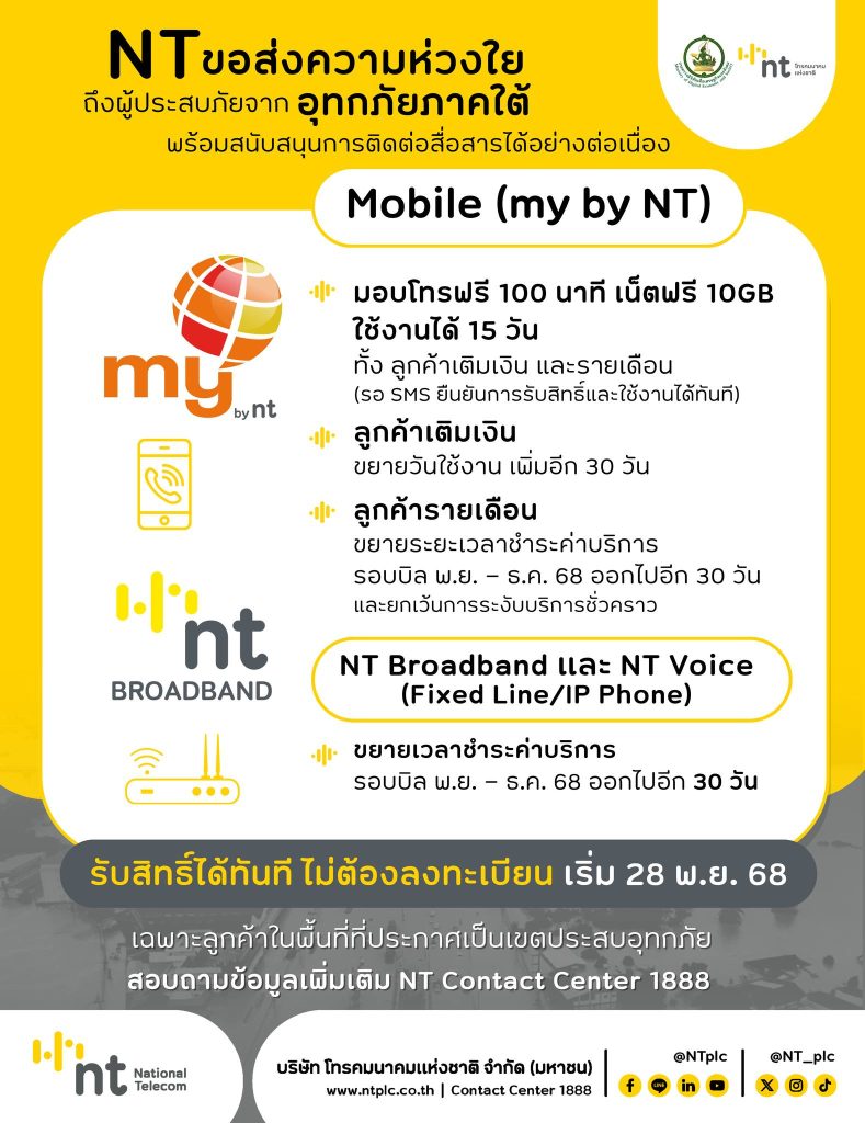 NT ห่วงใยผู้ประสบอุทกภัยภาคใต้ มอบโทรฟรี–เน็ตฟรี พร้อมขยายเวลาชำระค่าบริการเพื่อการสื่อสารที่ไม่สะดุด