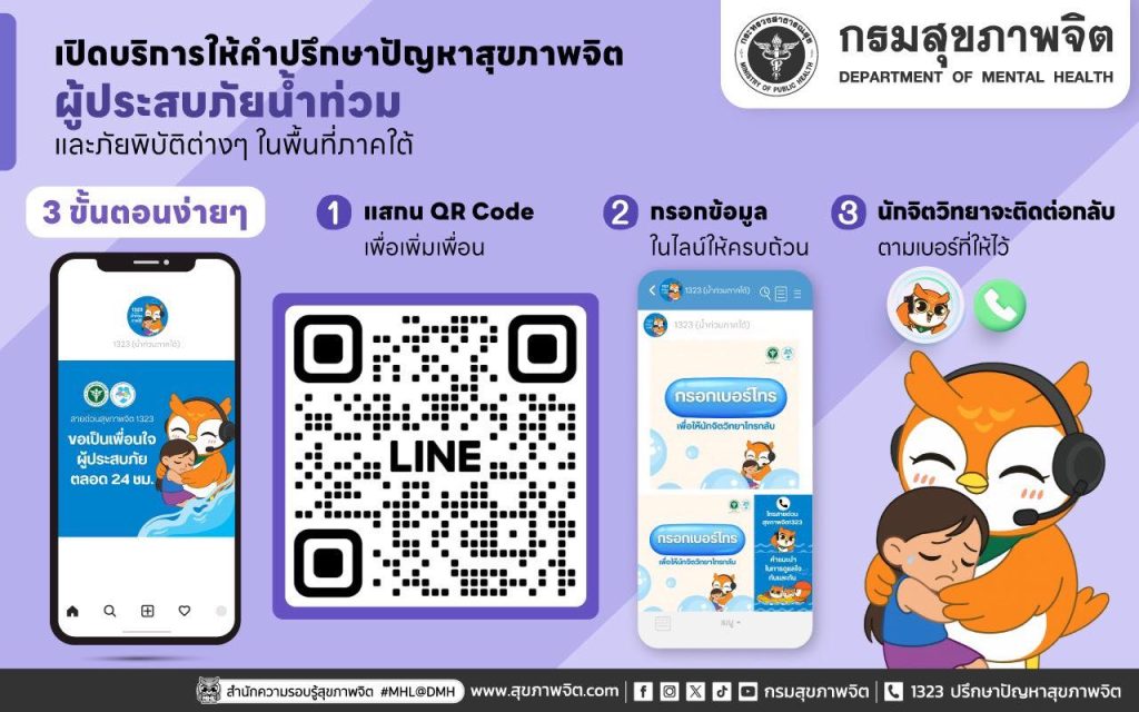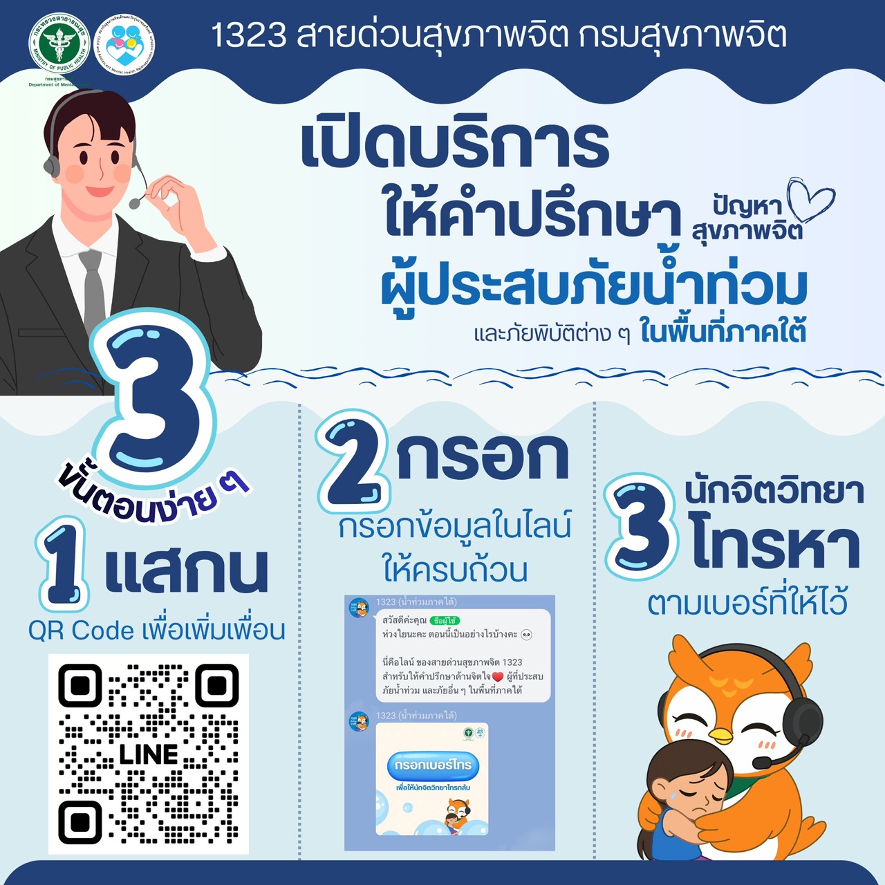 กรมสุขภาพจิต เปิด Line OA ให้การปรึกษาสุขภาพจิตกับผู้ที่ได้รับผลกระทบจากน้ำท่วมโดยเฉพาะ ข่าวสารกิจกรรม, สาธารณภัย กรมสุขภาพจิต เปิด Line OA ให้การปรึกษาสุขภาพจิตกับผู้ที่ได้รับผลกระทบจากน้ำท่วมโดยเฉพาะ กรมสุขภาพจิต เปิด Line OA ให้การปรึกษาสุขภาพจิตกับผู้ที่ได้รับผลกระทบจากน้ำท่วมโดยเฉพาะ เริ่มให้บริการตั้งแต่บัดนี้เป็นต้นไป กรมสุขภาพจิต เปิด Line OA ให้การปรึกษาสุขภาพจิตกับผู้ที่ได้รับผลกระทบจากน้ำท่วมโดยเฉพาะ เริ่มให้บริการตั้งแต่บัดนี้เป็นต้นไปแนวทางการใช้งาน Line OA 1323 (น้ำท่วมภาคใต้)ผู้ใช้งานกดเพิ่มเพื่อน (add friend Line@1323)กดเข้าไปที่หน้า chatเลือกลงทะเบียนขอรับบริการ ระบุวัน เวลา และเบอร์โทรศัพท์ที่สะดวกให้ติดต่อกลับนักจิตวิทยาการปรึกษาจะโทรติดต่อกลับเพื่อให้การปรึกษาด้านสุขภาพจิต โดยไม่มีค่าใช้จ่าย ที่มา :Facebook กรมสุขภาพจิต กระทรวงสาธารณสุขFacebook กรมสุขภาพจิต กระทรวงสาธารณสุข Post Views: 29 FacebookFacebookXTwitterLINELine
