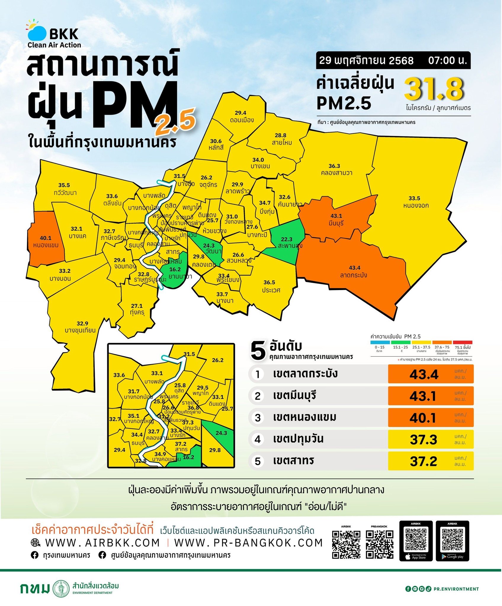 ศูนย์ข้อมูลคุณภาพอากาศกรุงเทพมหานคร รายงานสถานการณ์ฝุ่นละอองขนาดไม่เกิน 2.5 ไมครอน (PM 2.5) ในกรุงเทพมหานคร ประจำวันที่ 29 พฤศจิกายน 2568 เวลา 07:00 น. ค่าเฉลี่ยของกรุงเทพมหานคร 31.8 ไมโครกรัมต่อลูกบาศก์เมตร (มคก./ลบ.ม.) (ค่ามาตรฐาน 37.5 มคก./ลบ.ม.)