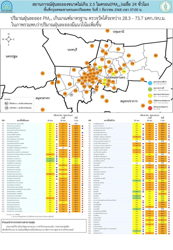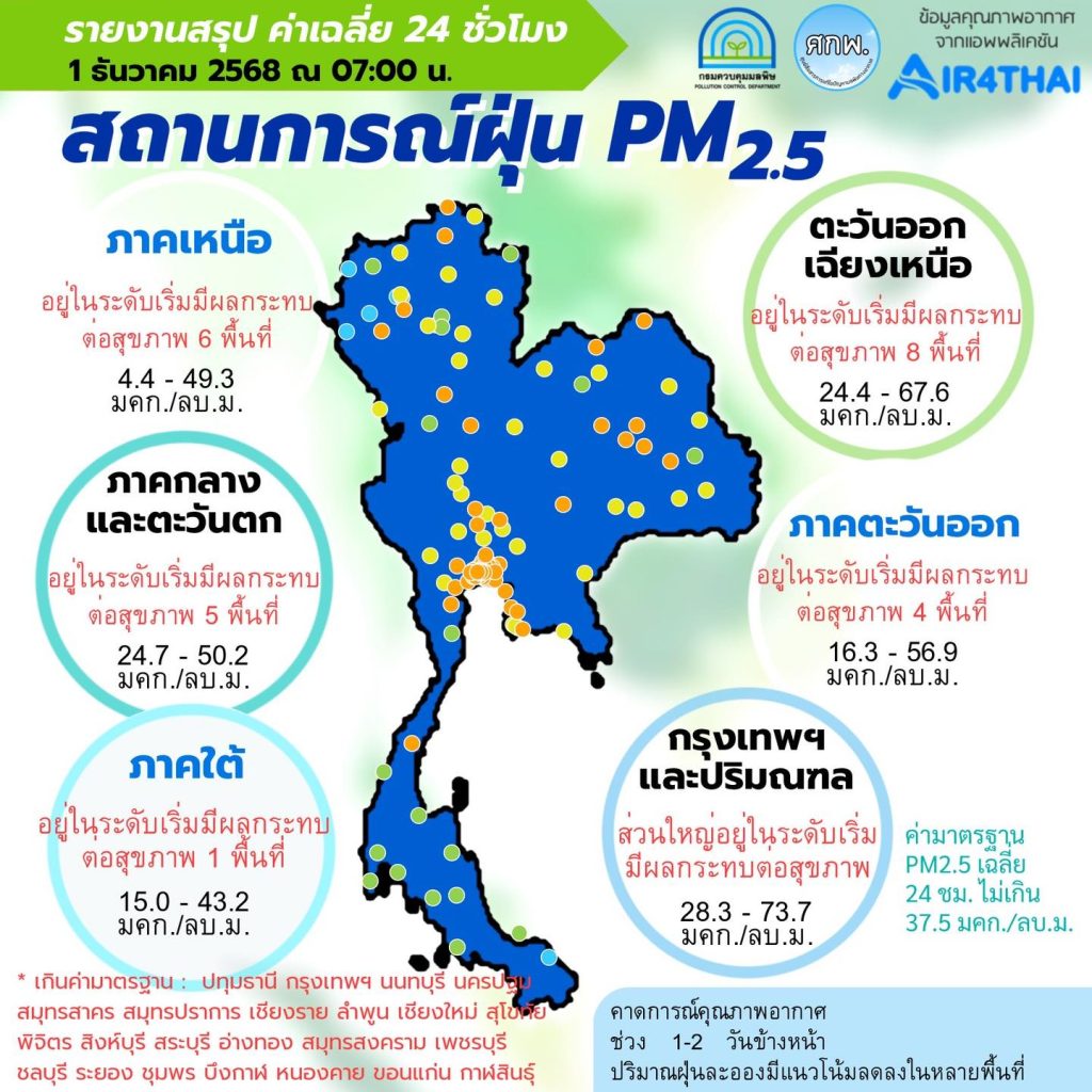ศูนย์สื่อสารการแก้ไขปัญหามลพิษทางอากาศ รายงานการติดตามตรวจสอบคุณภาพอากาศ ประจำวันที่ 1 ธันวาคม 2568 ณ 07:00 น สรุปดังนี้