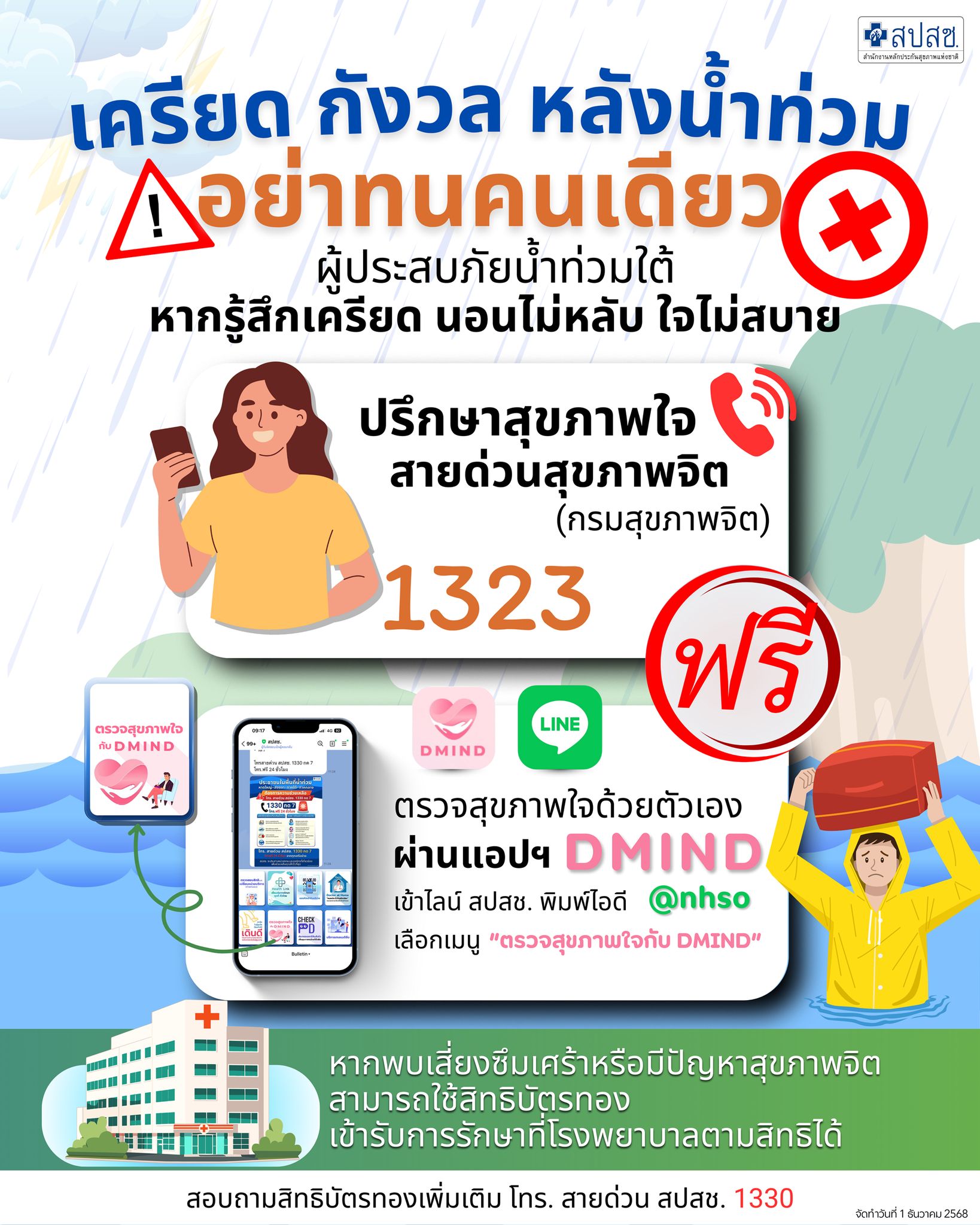 สปสช. แนะผู้ประสบภัยน้ำท่วมใต้ดูแลสุขภาพใจ เปิดสายด่วน 1323 และบริการตรวจสุขภาพใจ DMIND ผ่านไลน์