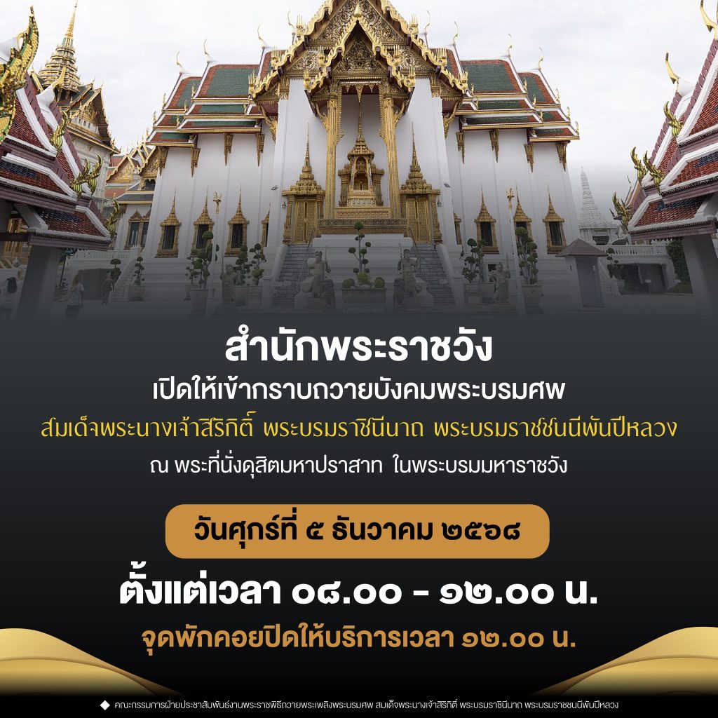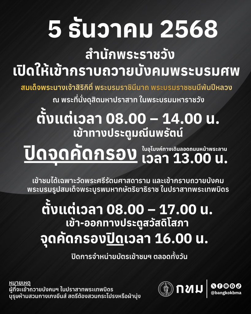 สำนักพระราชวัง เปิดให้เข้ากราบถวายบังคมพระบรมศพ สมเด็จพระนางเจ้าสิริกิติ์ฯ ในวันที่ 5 ธันวาคม 2568 ข่าวสารกิจกรรม, สมเด็จพระบรมราชชนนีพันปีหลวง สำนักพระราชวัง เปิดให้เข้ากราบถวายบังคมพระบรมศพ สมเด็จพระนางเจ้าสิริกิติ์ฯ ในวันที่ 5 ธันวาคม 2568 สำนักพระราชวัง เปิดให้ประชาชนเข้ากราบถวายบังคมพระบรมศพสมเด็จพระนางเจ้าสิริกิติ์ พระบรมราชินีนาถ พระบรมราชชนนีพันปีหลวง วันที่ 5 ธันวาคม 2568 ตั้งแต่เวลา 08.00 – 12.00 น. (จุดพักคอยปิดให้บริการ เวลา 12.00 น.) วันศุกร์ที่ 5 ธันวาคม 2568 สำนักพระราชวัง ประกาศแจ้งเวลาเปิดให้ประชาชนเข้ากราบถวายบังคมพระบรมศพ สมเด็จพระนางเจ้าสิริกิติ์ พระบรมราชินีนาถ พระบรมราชชนนีพันปีหลวง ณ พระที่นั่งดุสิตมหาปราสาท ในพระบรมมหาราชวังตั้งแต่เวลา 08.00 – 12.00 น. (จุดพักคอยปิดให้บริการ เวลา 12.00 น.) สำนักพระราชวังประกาศเปิดให้ประชาชนเข้ากราบถวายบังคมพระบรมศพ สมเด็จพระนางเจ้าสิริกิติ์ พระบรมราชินีนาถ พระบรมราชชนนีพันปีหลวง ณ พระที่นั่งดุสิตมหาปราสาท ในพระบรมมหาราชวัง ในวันที่ 5 ธันวาคม 2568 ระหว่างเวลา 08.00 – 14.00 น. โดยจะปิดจุดคัดกรองบริเวณอุโมงค์ทางเดินลอดถนนหน้าพระลานในเวลา 13.00 น. ในวันเดียวกัน ประชาชนยังสามารถเข้าชม วัดพระศรีรัตนศาสดาราม และเข้ากราบถวายบังคม พระบรมรูปสมเด็จพระบูรพมหากษัตริยาธิราช ณ ปราสาทพระเทพบิดร ได้ตั้งแต่เวลา 08.30 – 17.00 น. โดยเข้า – ออกทาง ประตูสวัสดิโสภา และปิดจุดคัดกรองในเวลา 16.00 น. ทั้งนี้ งดจำหน่ายบัตรเข้าชมตลอดทั้งวันสำนักพระราชวังกำชับให้แต่งกายสุภาพตามระเบียบบุรุษ ห้ามสวมกางเกงยีนส์สตรี ต้องสวมกระโปรงหรือผ้าถุง ที่มา :Facebook พระลานFacebook กรุงเทพมหานคร Post Views: 26 FacebookFacebookXTwitterLINELine