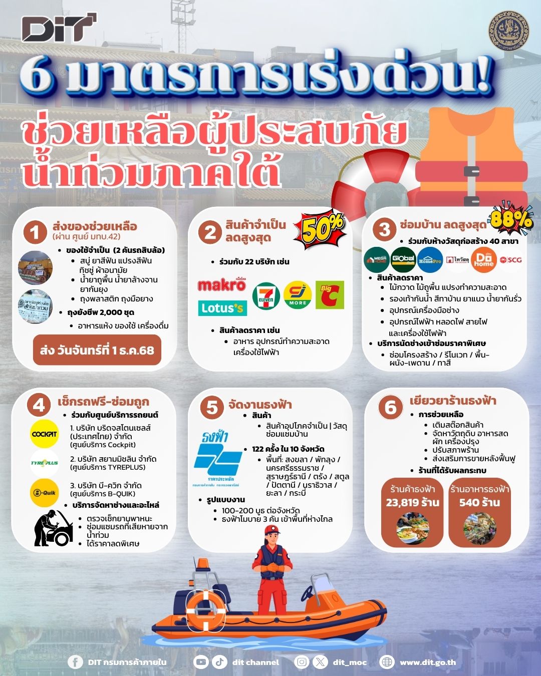 กรมการค้าภายใน เดินหน้ามาตรการเร่งด่วน ช่วยเหลือผู้ประสบอุทกภัยภาคใต้ ตั้งแต่การจัดส่งของใช้จำเป็นและถุงยังชีพลงพื้นที่อย่างต่อเนื่อง การร่วมมือผู้ประกอบการลดราคาสินค้าจำเป็นสูงสุดกว่า 50% รวมถึงความร่วมมือกับห้างวัสดุก่อสร้าง ลดค่าวัสดุซ่อมบ้านสูงสุดถึง 88%