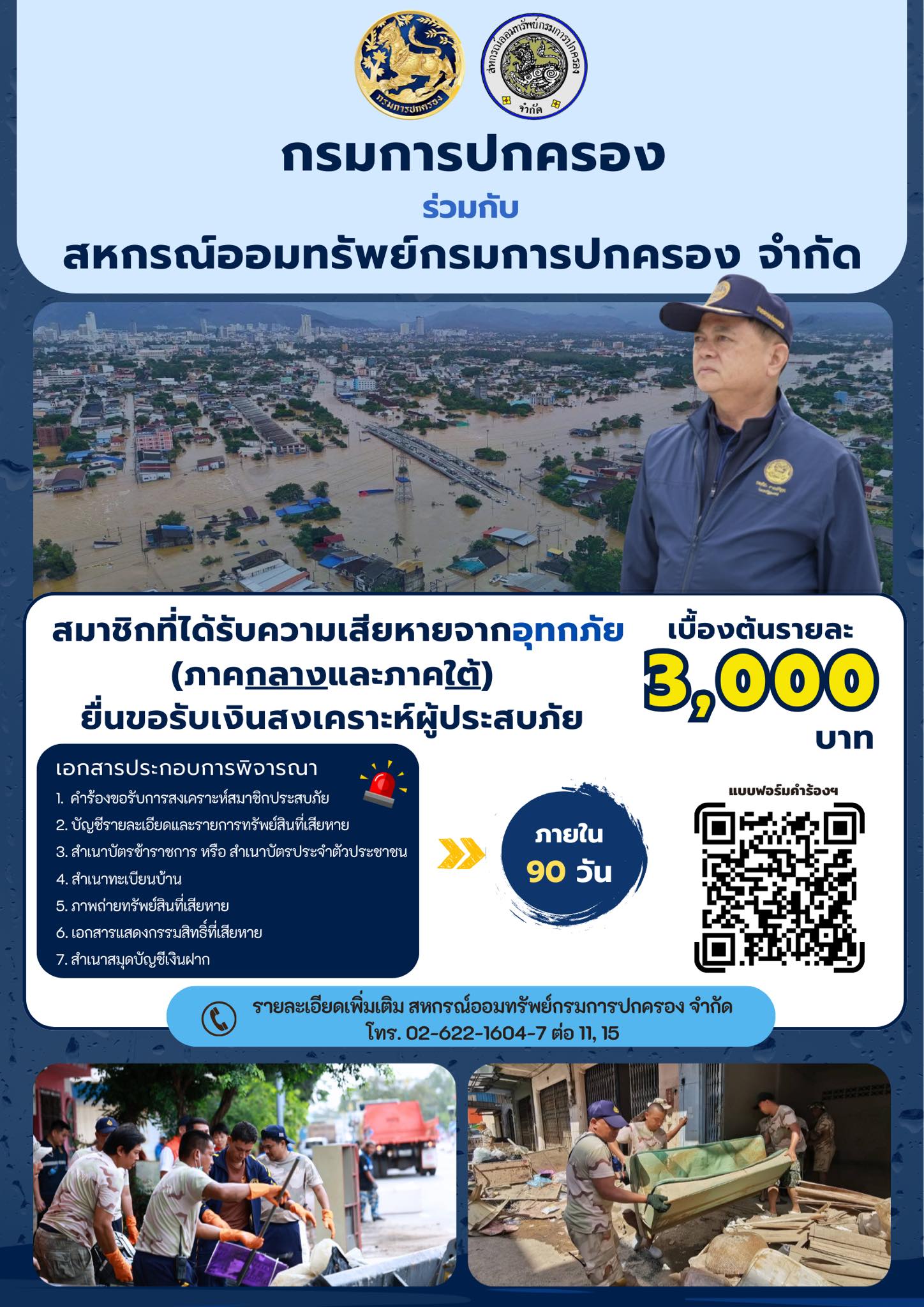 กรมการปกครอง ร่วมกับ สหกรณ์ออมทรัพย์กรมการปกครอง จำกัด ช่วยเหลือสมาชิกที่ประสบอุทกภัย (ภาคกลางและภาคใต้) ข่าวสารกิจกรรม, สาธารณภัย กรมการปกครอง ร่วมกับ สหกรณ์ออมทรัพย์กรมการปกครอง จำกัด ช่วยเหลือสมาชิกที่ประสบอุทกภัย (ภาคกลางและภาคใต้) กรมการปกครอง ร่วมกับ สหกรณ์ออมทรัพย์กรมการปกครอง จำกัด ช่วยเหลือสมาชิกที่ประสบอุทกภัย เบื้องต้นรายละ 3,000 บาท สมาชิกที่ได้รับความเสียหายจากอุทกภัย (ภาคกลางและภาคใต้) สามารถยื่นขอรับเงินสงเคราะห์ผู้ประสบภัย ภายใน 90 วันเอกสารประกอบการพิจารณา ดังนี้คำร้องขอรับการสงเคราะห์สมาชิกประสบภัยบัญชีรายละเอียดและรายการทรัพย์สินที่เสียหายสำเนาบัตรข้าราชการ หรือ สำเนาบัตรประจำตัวประชาชนสำเนาทะเบียนบ้านภาพถ่ายทรัพย์สินที่เสียหายเอกสารแสดงกรรมสิทธิ์ที่เสียหายสำเนาสมุดบัญชีเงินฝากรายละเอียดเพิ่มเติม สอบถามเพิ่มเติมได้ที่โทร. 02 622 1604 – 7 ต่อ 11 , 15 ที่มา : Facebook กรมการปกครอง fanpage Post Views: 14 FacebookFacebookXTwitterLINELine