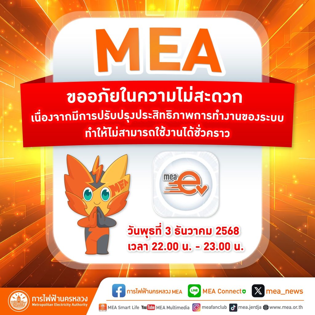 การไฟฟ้านครหลวง แจ้งปิดปรับปรุงแอปพลิเคชัน MEA EV เนื่องจากมีการปรับปรุงประสิทธิภาพการทำงานของระบบ ในวันพุธที่ 3 ธันวาคม 2568 เวลา 22.00 – 23.00 น. ทำให้ไม่สามารถใช้งานแอปพลิเคชัน MEA EV ได้ชั่วคราว