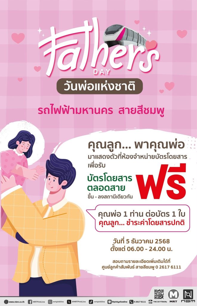 รถไฟฟ้ามหานคร สายสีชมพู เชิญชวนร่วมกิจกรรมวันพ่อแห่งชาติ นั่งรถไฟฟ้าฟรีตลอดสาย เพื่อส่งเสริมความสัมพันธ์ที่ดีภายในครอบครัว โดยคุณลูกพาคุณพ่อ มาแสดงตัวที่ห้องจำหน่ายบัตรโดยสาร ในวันที่ 5 ธันวาคม 2568 ตั้งแต่เวลา 06.00 – 24.00 น. ทุกสถานี สามารถรับบัตรโดยสารฟรีทันที 1 ใบ สำหรับคุณพ่อ ส่วนคุณลูกยังต้องชำระค่าโดยสารปกติ และบริษัทฯ ยังได้ยกเว้นค่าโดยสารสำหรับเด็กที่มีส่วนสูงไม่เกิน 90 ซม.