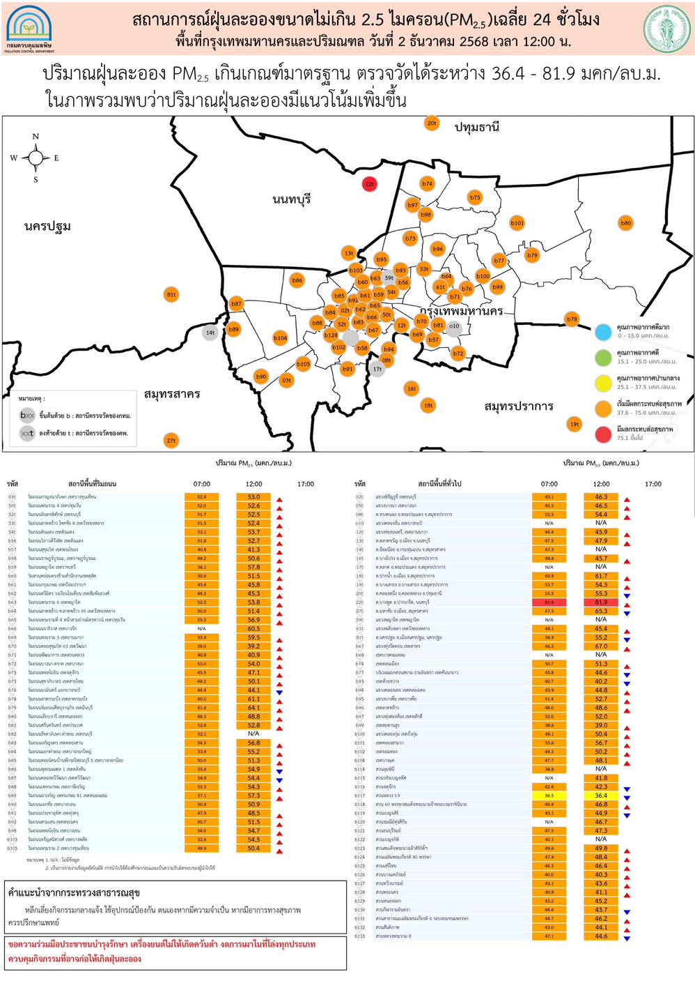 ศูนย์สื่อสารการแก้ไขปัญหามลพิษทางอากา รายงานการติดตามตรวจสอบคุณภาพอากาศ ประจำวันที่ 2 ธันวาคม 2568 เวลา 12.00 น.