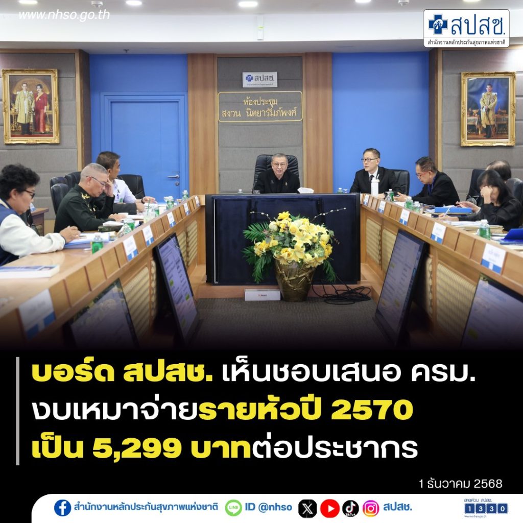 เมื่อวันที่ 1 ธันวาคม 2568 ในการประชุมคณะกรรมการหลักประกันสุขภาพแห่งชาติ (บอร์ด สปสช.) โดยมี นพ.วิชัย โชควิวัฒน กรรมการหลักประกันสุขภาพแห่งชาติ ทำหน้าที่เป็นประธานการประชุมครั้งนี้ ด้วย นายพัฒนา พร้อมพัฒน์ รัฐมนตรีว่าการกระทรวงสาธารณสุข ในฐานะประธานกรรมการหลักประกันสุขภาพแห่งชาติ ติดภารกิจไม่สามารถร่วมประชุมได้ ซึ่งที่ประชุมได้มีมติเห็นชอบ “ข้อเสนองบประมาณกองทุนหลักประกันสุขภาพแห่งชาติ (บัตรทอง 30 บาท) ปีงบประมาณ 2570” พร้อมมอบหมายให้ สปสช. เสนอคณะรัฐมนตรีพิจารณาตามมาตรา 39 แห่ง พ.ร.บ.หลักประกันสุขภาพแห่งชาติ พ.ศ. 2545 ต่อไป ทั้งนี้ หากรัฐบาลมีการประกาศนโยบายที่เกี่ยวข้องกับหลักประกันสุขภาพแห่งชาติเพิ่มเติม สามารถปรับงบประมาณรองรับได้ตามความเหมาะสม