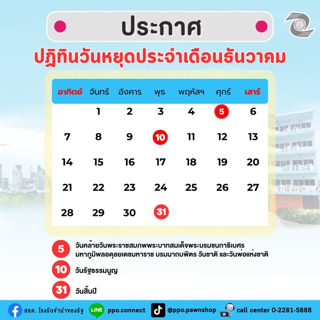 สำนักงานธนานุเคราะห์ โรงรับจำนำของรัฐ แจ้งวันหยุด ประจำเดือนธันวาคม 2568 ดังนี้