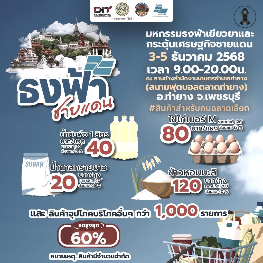 กรมการค้าภายใน จัดงาน “ธงฟ้าเยียวยาและกระตุ้นเศรษฐกิจชายแดน จังหวัดเพชรบุรี” วันที่ 3 – 5 ธ.ค. 68