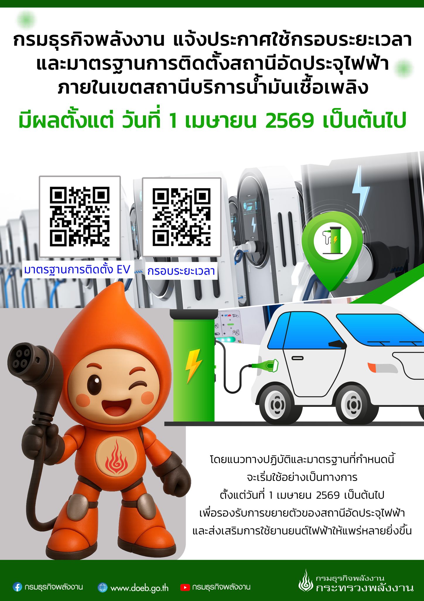 กรมธุรกิจพลังงาน แจ้งประกาศใช้กรอบระยะเวลาและมาตรฐานการติดตั้งสถานีอัดประจุไฟฟ้าภายในสถานีบริการน้ำมันเชื้อเพลิง มีผลตั้งแต่วันที่ 1 เมษายน 2569”