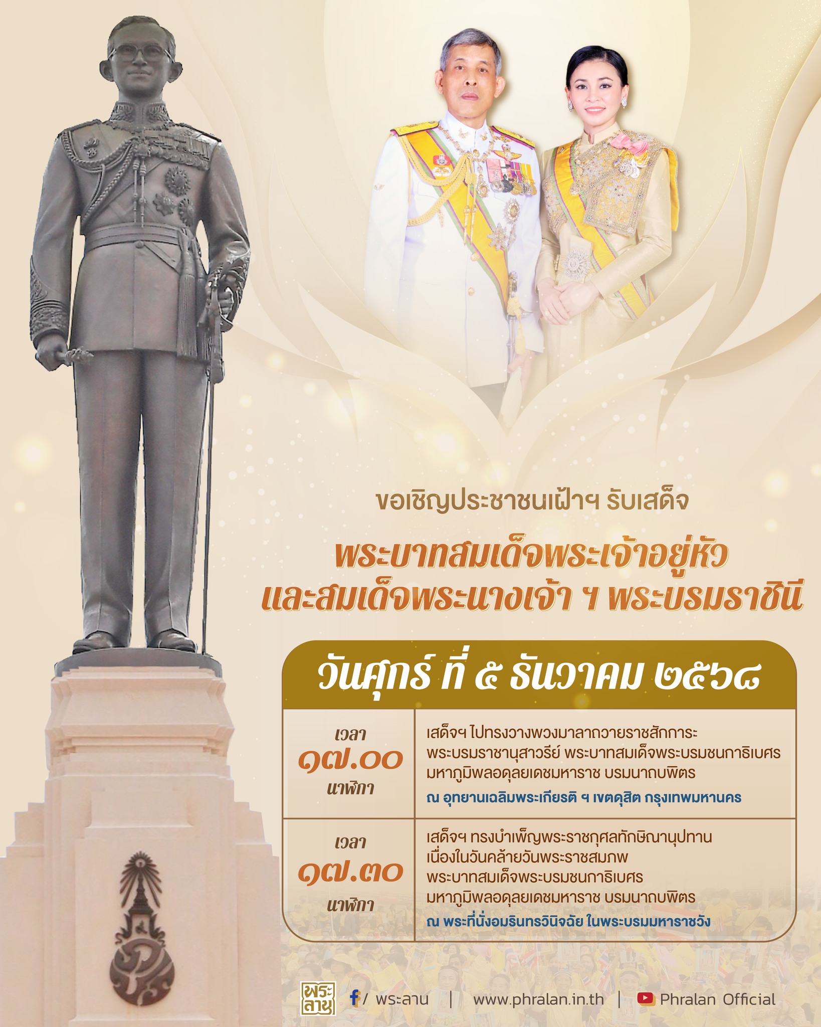 ขอเชิญประชาชนเฝ้าฯ รับเสด็จพระบาทสมเด็จพระเจ้าอยู่หัว และสมเด็จพระนางเจ้า ฯ พระบรมราชินี ในการเสด็จพระราชดำเนินไปทรงวางพวงมาลาถวายราชสักการะพระบรมราชานุสาวรีย์ พระบาทสมเด็จพระบรมชนกาธิเบศร มหาภูมิพลอดุลยเดชมหาราช บรมนาถบพิตร และเสด็จพระราชดำเนินทรงบำเพ็ญพระราชกุศลทักษิณานุปทาน เนื่องในวันคล้ายวันพระบรมราชสมภพ วันที่ 5 ธันวาคม 2568 ณ อุทยานเฉลิมพระเกียรติฯ และพระที่นั่งอมรินทรวินิจฉัย พระบรมมหาราชวัง ในวันศุกร์ที่ 5 ธันวาคม 2568 เวลา 17.00 น. และเวลา 17.30 น.