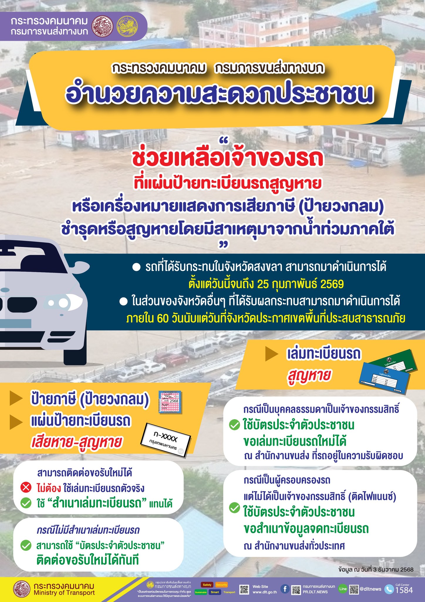 นายพิพัฒน์ รัชกิจประการ รองนายกรัฐมนตรีและรัฐมนตรีว่าการกระทรวงคมนาคม พร้อมด้วย นางสาวมัลลิกา จิระพันธุ์วาณิช รัฐมนตรีช่วยว่าการกระทรวงคมนาคม มอบนโยบายเร่งด่วนให้กรมการขนส่งทางบกบูรณาการความร่วมมือกับทุกภาคส่วนเพื่อบรรเทาความเดือดร้อน โดยเฉพาะปัญหาเรื่องยานพาหนะซึ่งเป็นปัจจัยสำคัญในการดำรงชีวิต ด้าน นายสรพงศ์ ไพฑูรย์พงษ์ อธิบดีกรมการขนส่งทางบก กล่าวว่า กรมการขนส่งทางบก อำนวยความสะดวกช่วยเหลือเจ้าของรถที่แผ่นป้ายทะเบียนรถ เครื่องหมายแสดงการเสียภาษี (ป้ายวงกลม) หรือคู่มือจดทะเบียน (เล่มทะเบียนรถ) ชำรุดหรือสูญหายโดยมีสาเหตุมาจากน้ำท่วมในเหตุการณ์อุทกภัยภาคใต้ ไม่ต้องใช้เล่มทะเบียนรถฉบับจริง โดยสามารถใช้สำเนาเล่มทะเบียนรถ หรือกรณีไม่มีสำเนาเล่มทะเบียนรถ สามารถใช้เพียงบัตรประจำตัวประชาชนของเจ้าของรถมาติดต่อได้ ทั้งนี้ เพื่อลดภาระค่าใช้จ่ายในการนำเล่มทะเบียนรถมาจากสถาบันการเงิน โดยสามารถยื่นขอดำเนินการได้ทุกสำนักงานขนส่งทั่วประเทศ อนึ่ง สำหรับรถที่ได้รับผลกระทบในจังหวัดสงขลา สามารถดำเนินการได้ตั้งแต่วันนี้จนถึง 25 กุมภาพันธ์ 2569 ในส่วนของจังหวัดอื่นๆ ที่ได้รับผลกระทบสามารถดำเนินการได้ภายใน 60 วันนับแต่วันที่จังหวัดประกาศเขตพื้นที่ประสบสาธารณภัย (อุทกภัย) โดยมีหลักฐานดังนี้