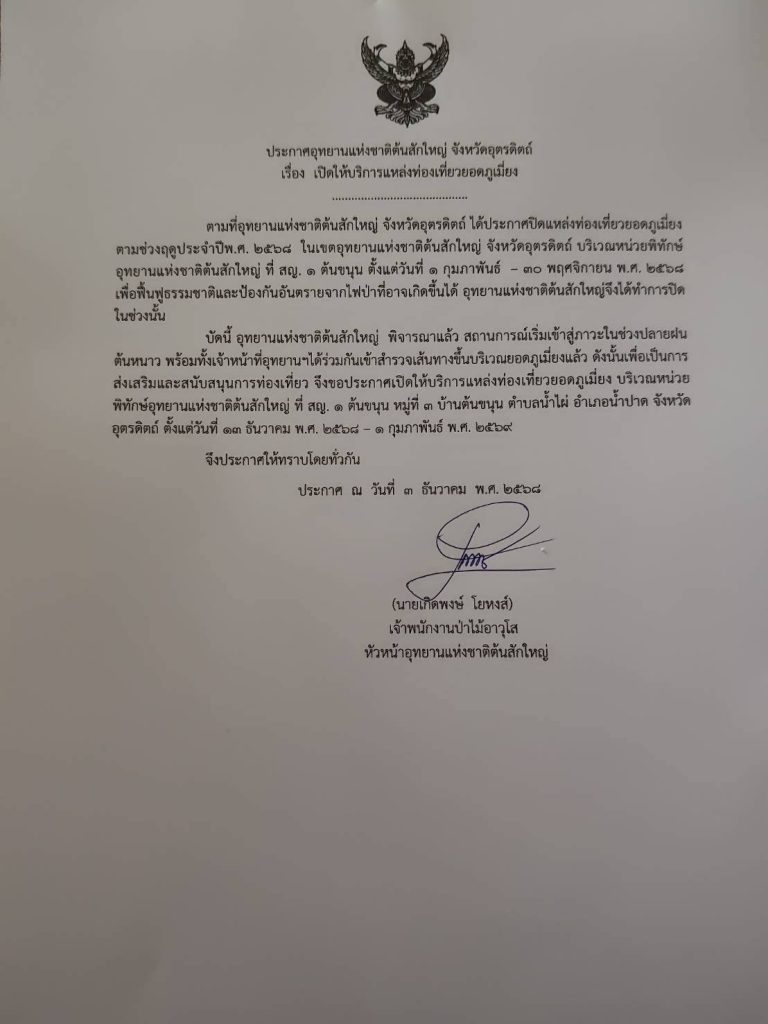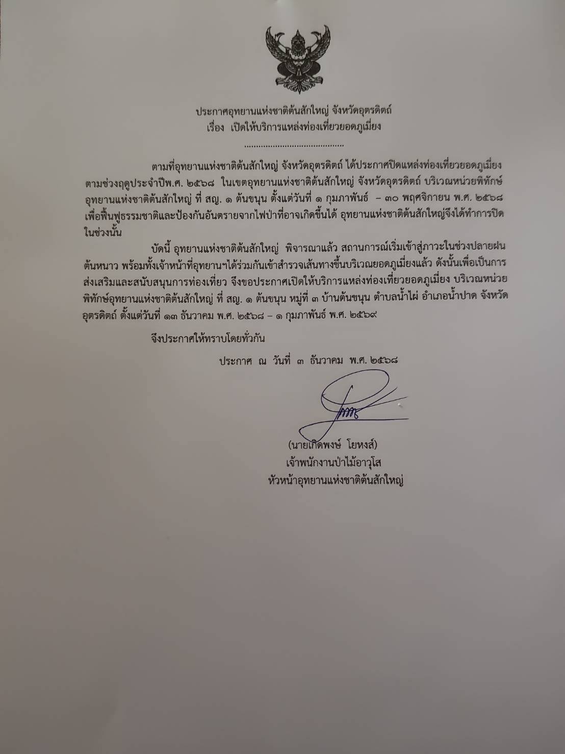 ตามที่อุทยานแห่งชาติต้นสักใหญ่ จังหวัดอุตรดิตถ์ ได้ประกาศปิดแหล่งท่องเที่ยวยอดภูเมี่ยง ตามช่วงฤดูประจําปีพ.ศ. 2568 ในเขตอุทยานแห่งชาติต้นสักใหญ่ จังหวัดอุตรดิตถ์ บริเวณหน่วยพิทักษ์ อุทยานแห่งชาติต้นสักใหญ่ ที่ สญ. 1 ต้นขนุน ตั้งแต่วันที่ 9 กุมภาพันธ์ ที่ – 30 พฤศจิกายน พ.ศ. 2568เพื่อฟื้นฟูธรรมชาติและป้องกันอันตรายจากไฟป่าที่อาจเกิดขึ้นได้ อุทยานแห่งชาติต้นสักใหญ่จึงได้ทําการปิด บัดนี้ อุทยานแห่งชาติต้นสักใหญ่ พิจารณาแล้ว สถานการณ์เริ่มเข้าสู่ภาวะในช่วงปลายฝน ต้นหนาว พร้อมทั้งเจ้าหน้าที่อุทยานฯได้ร่วมกันเข้าสํารวจเส้นทางขึ้นบริเวณยอดภูเมี่ยงแล้ว ดังนั้นเพื่อเป็นการ ส่งเสริมและสนับสนุนการท่องเที่ยว จึงขอประกาศเปิดให้บริการแหล่งท่องเที่ยวยอดภูเมี่ยง บริเวณหน่วย พิทักษ์อุทยานแห่งชาติต้นสักใหญ่ ที่ สญ. 1 ต้นขนุน หมู่ที่ 3 บ้านต้นขนุน ตําบลน้ำไผ่ อําเภอน้ำปาด จังหวัด อุตรดิตถ์ ตั้งแต่วันที่ 13 ธันวาคม พ.ศ. 2568 – 1 กุมภาพันธ์ พ.ศ. 2569