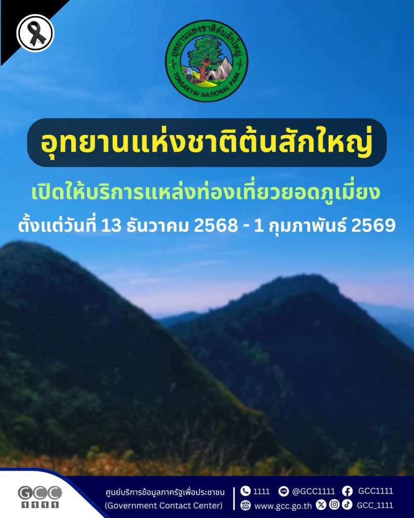 อุทยานแห่งชาติต้นสักใหญ่ เปิดให้บริการแหล่งท่องเที่ยวยอดภูเมี่ยง บริเวณหน่วย พิทักษ์อุทยานแห่งชาติต้นสักใหญ่ ตั้งแต่วันที่ 13 ธันวาคม 2568 – 1 กุมภาพันธ์ 2569