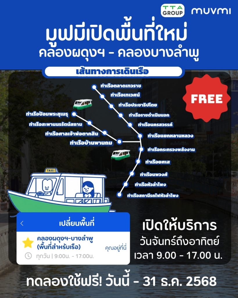 กรุงเทพมหานคร เปิดเผย เรือแท็กซี่ไฟฟ้า เปิดให้บริการแบบทดลองใช้ฟรี โดยไม่เสียค่าบริการ ผ่านแอปพลิเคชั่น MUVMI เริ่มแล้ววันนี้ – 31 ธันวาคม 2568 โดยพื้นที่ให้บริการจะอยู่บริเวณเส้นทาง คลองผดุงกรุงเกษม และคลองบางลำพู ในช่วงเวลา 09.00 – 17.00 น. ทุกวัน
