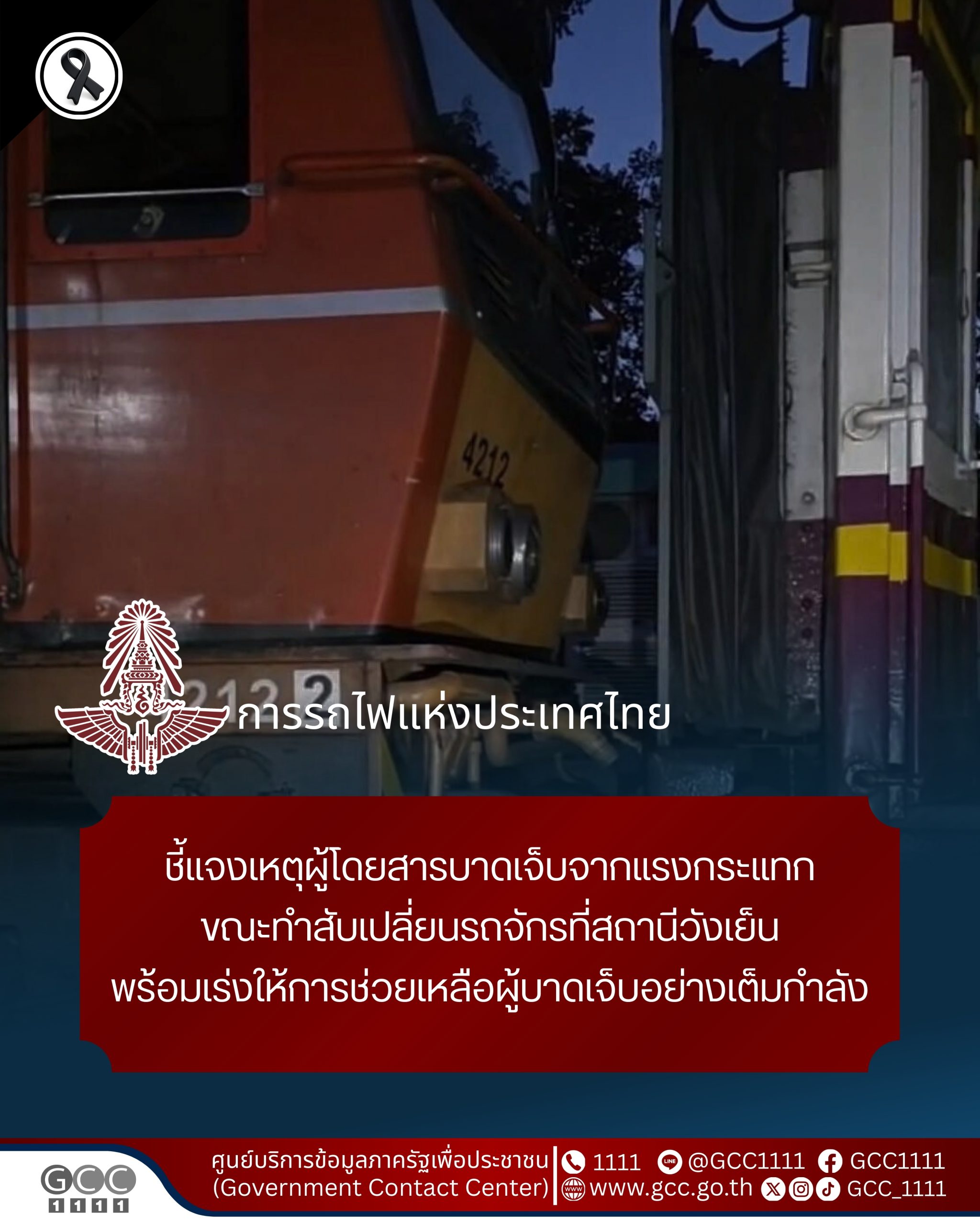 การรถไฟแห่งประเทศไทย ขอชี้แจงกรณีเกิดเหตุผู้โดยสารได้รับบาดเจ็บบนขบวนรถท้องถิ่นที่ 486 ระหว่างสถานีน้ำตก – กาญจนบุรี ขณะทำสับเปลี่ยนรถจักรที่สถานีวังเย็น เมื่อเวลา 17.02 น. ของวันที่ 6 ธันวาคม 2568 โดยจากรายงานแจ้งเหตุ พบว่า ในระหว่างการสับเปลี่ยนรถจักรดีเซลระหว่างขบวนรถที่ 259 และขบวนที่ 486 รถจักรดีเซลหมายเลข 4212 ได้เข้าต่อขบวนรถด้วยแรงกระแทก ทำให้มีผู้โดยสารบนขบวนได้รับบาดเจ็บ จำนวน 13 ราย