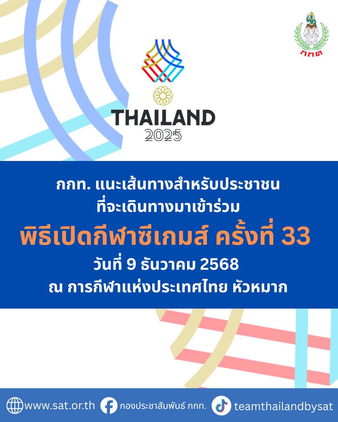 ดร.ก้องศักด ยอดมณี ผู้ว่าการการกีฬาแห่งประเทศไทย (กกท.) เปิดเผยว่า ตามที่ประเทศไทย เป็นเจ้าภาพจัดการแข่งขันกีฬาซีเกมส์ ครั้งที่ 33 ระหว่างวันที่ 9 – 20 ธันวาคม 2568 คณะกรรมการจัดการแข่งขันกีฬาซีเกมส์ ได้กำหนดให้ กกท. จัดอำนวยความสะดวกให้กับประชาชน นักกีฬา และผู้ที่เข้าร่วมพิธีเปิด นั้น เนื่องจาก มีผู้ที่เกี่ยวข้องที่จะเข้าร่วมในพิธีดังกล่าวจำนวนมาก ดังนั้น จึงต้องมีการบริหารจัดการ โดยอำนวยความสะดวกยานพาหนะให้กับประชาชนที่จะเดินทางเข้าบริเวณสนามหัวหมาก โดยมีข้อแนะนำสำหรับผู้ที่จะเข้ามาร่วมงาน ดังนี้